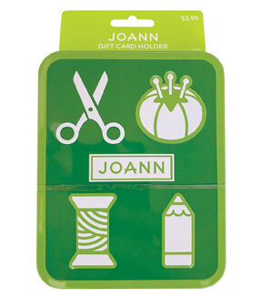 Place a gift card in the JOANN Rectangle Gift Card Holder - Hobbies and gift it to your favorite person. This metal gift card holder is designed with a beveled lid in lovely shades of green and comes with a flocked tray. The lid flaunts a print of a pin cushion, pair of scissors, pencil and thread spool.