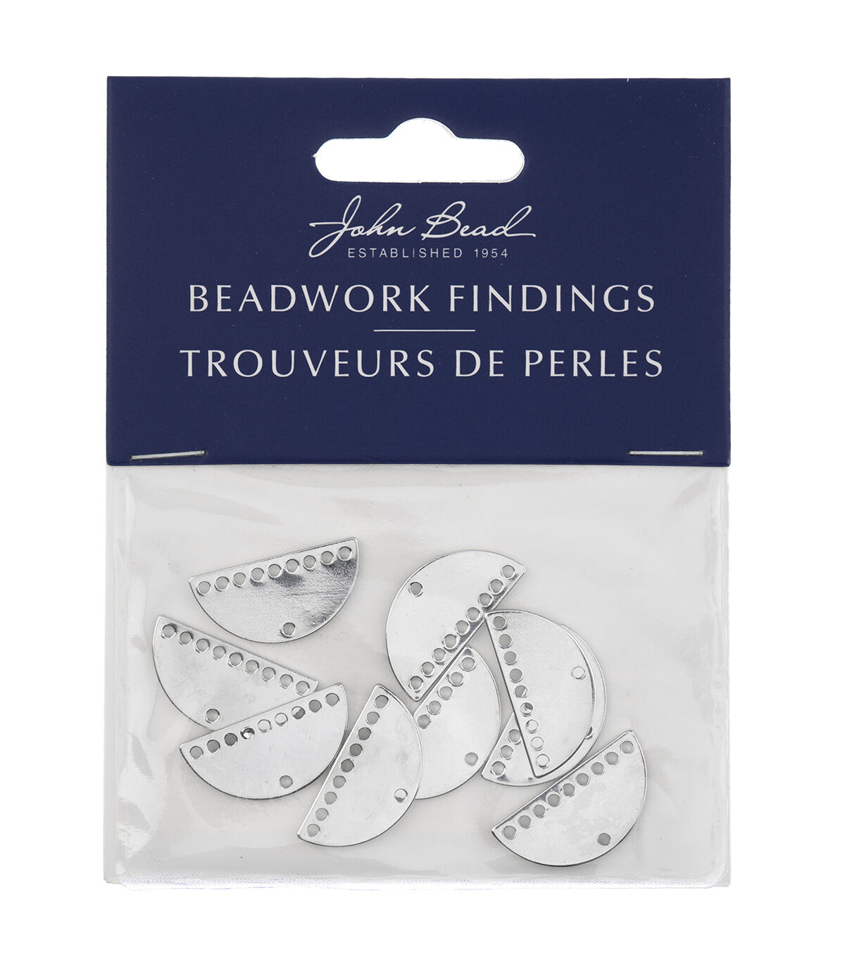 These are new Silver Beadwork Findings by John Bead. The product is a Silver Pendant shaped like a Half Moon Semi Circle with 9+1 holes.