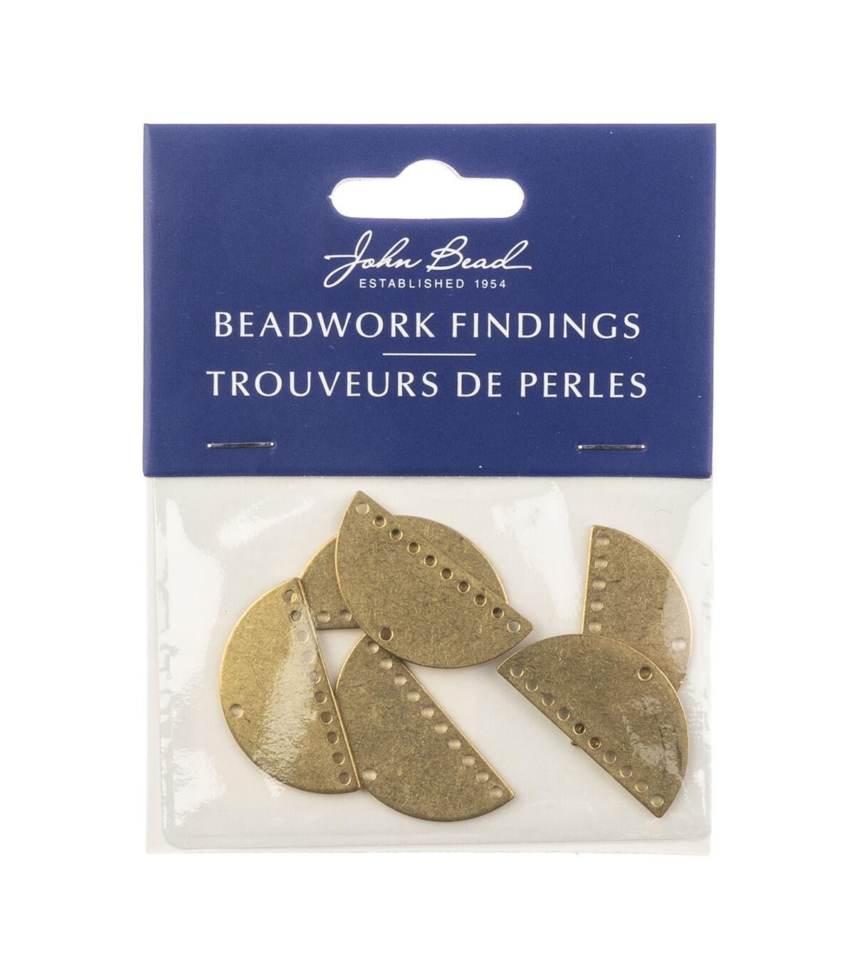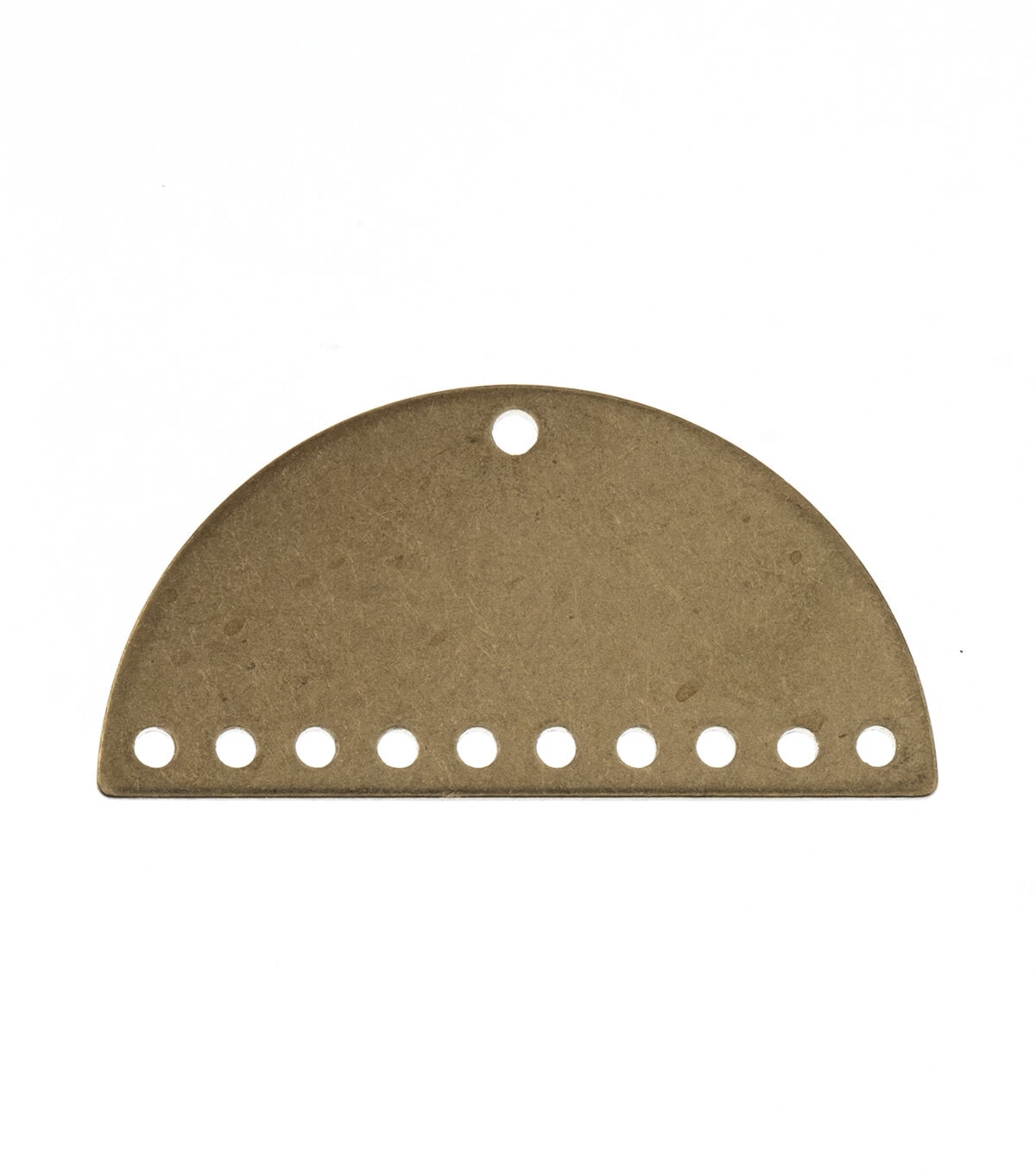 These are new Gold Beadwork Findings by John Bead. The product is a Gold Pendant shaped like a Half Moon Semi Circle with 10+1 holes.