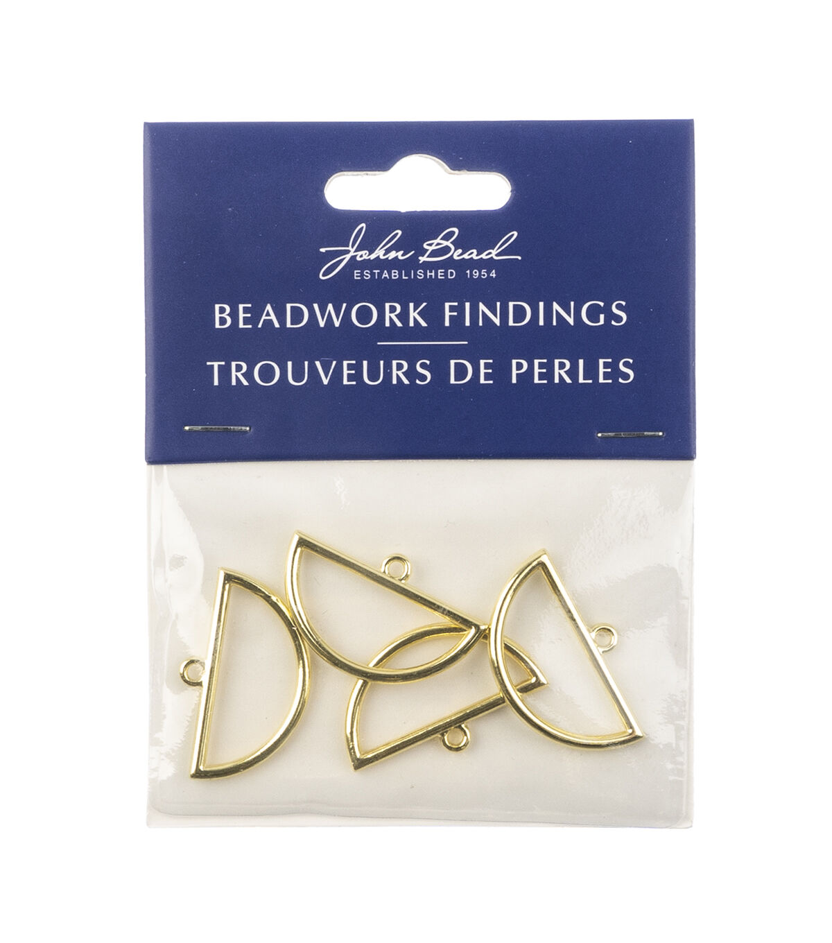 These are new Gold Beadwork Findings by John Bead. The product is a Gold Pendant shaped like a Half Circle.