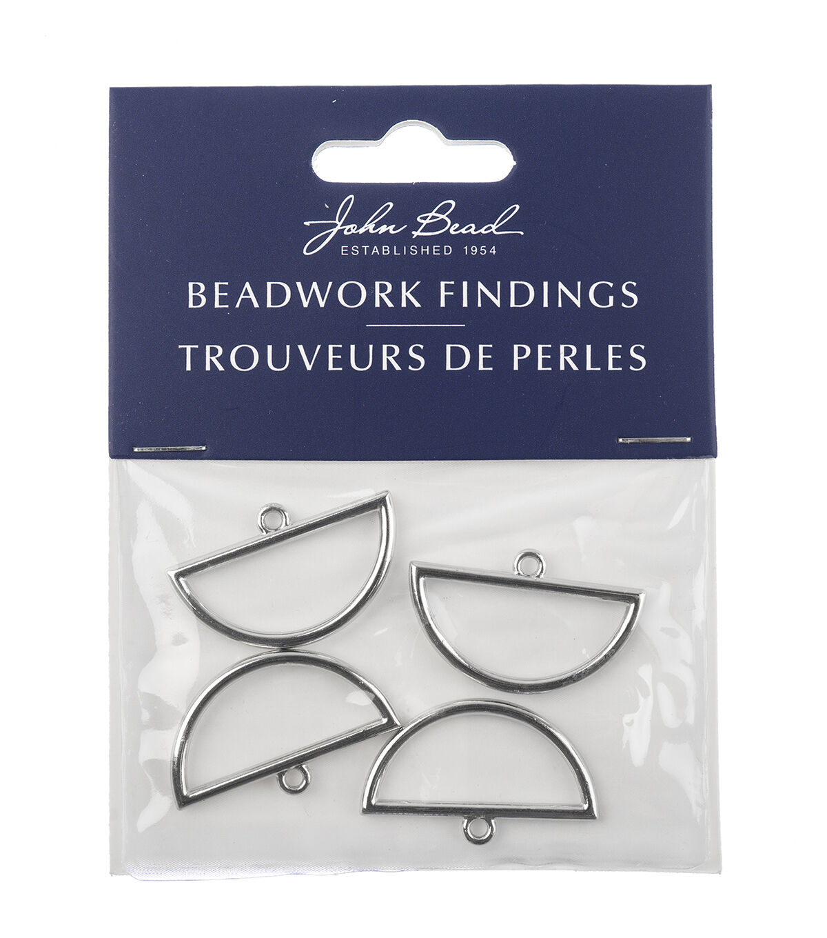 These are new Silver Beadwork Findings by John Bead. The product is a Silver Pendant shaped like a Half Circle.