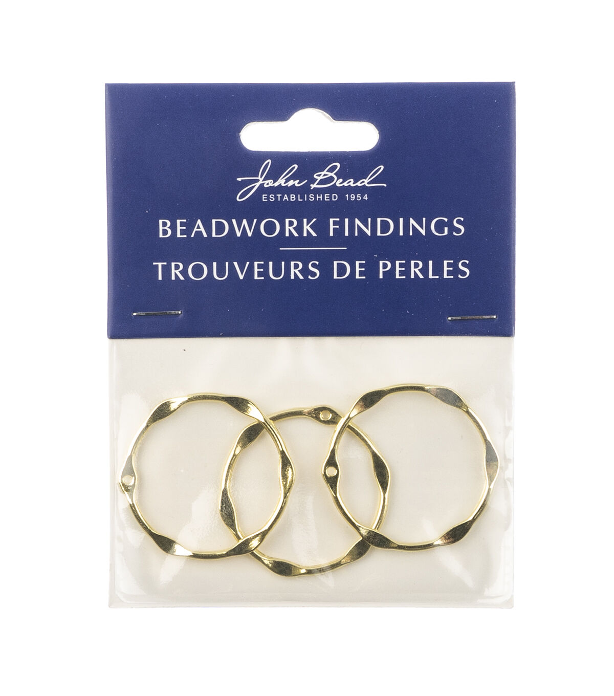 These are new Gold Beadwork Findings by John Bead. The product is a Gold Pendant shaped like a Partly Flattened Circle.