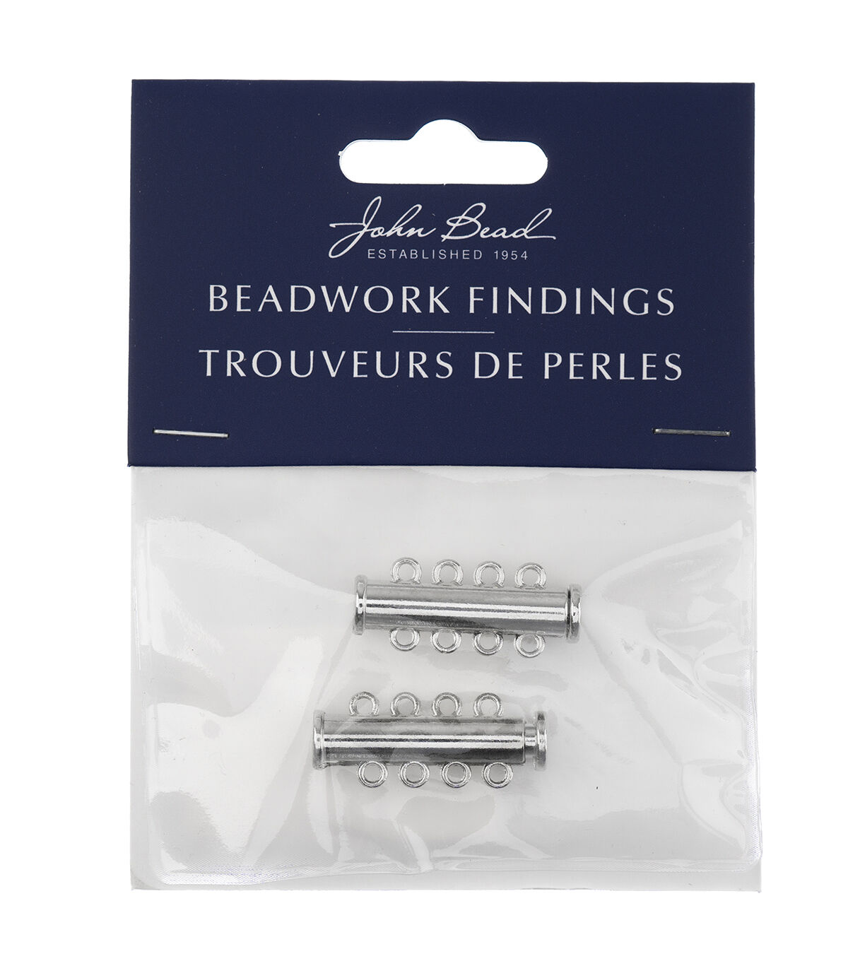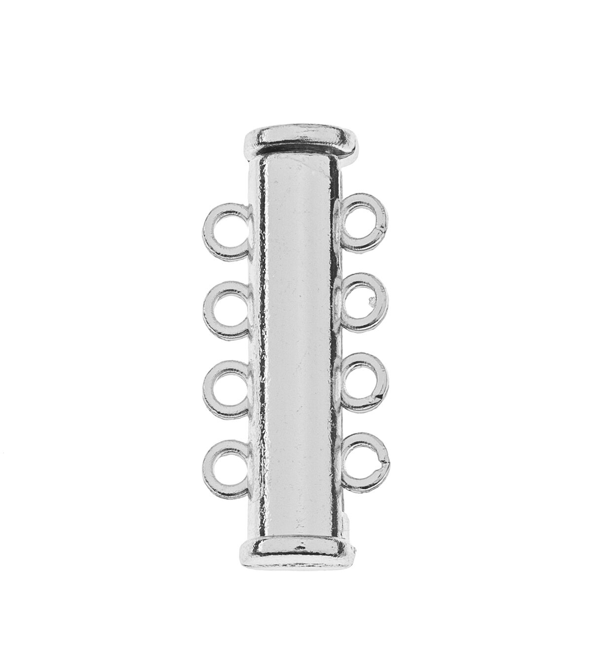 These are new Silver Beadwork Findings by John Bead. The product is a Silver Pendant shaped like a Tube Slide Clasp with 4 strands.