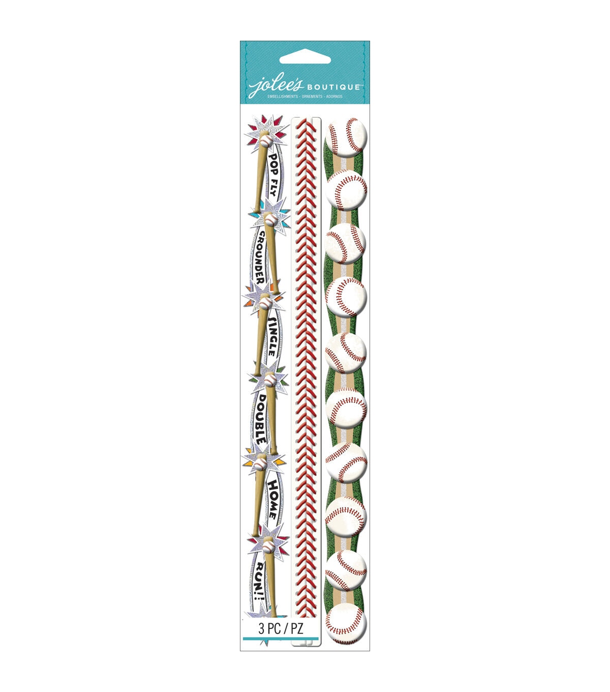 EK SUCCESS-Jolee's Boutique: Dimensional Stickers. Mixed media dimensional stickers in a variety of themes and designs perfect for any and every occasion. This package contains Baseball: three dimensional stickers on one 11-3/4x3 inch backing sheet. Not edible, for crafting purposes only. Imported.