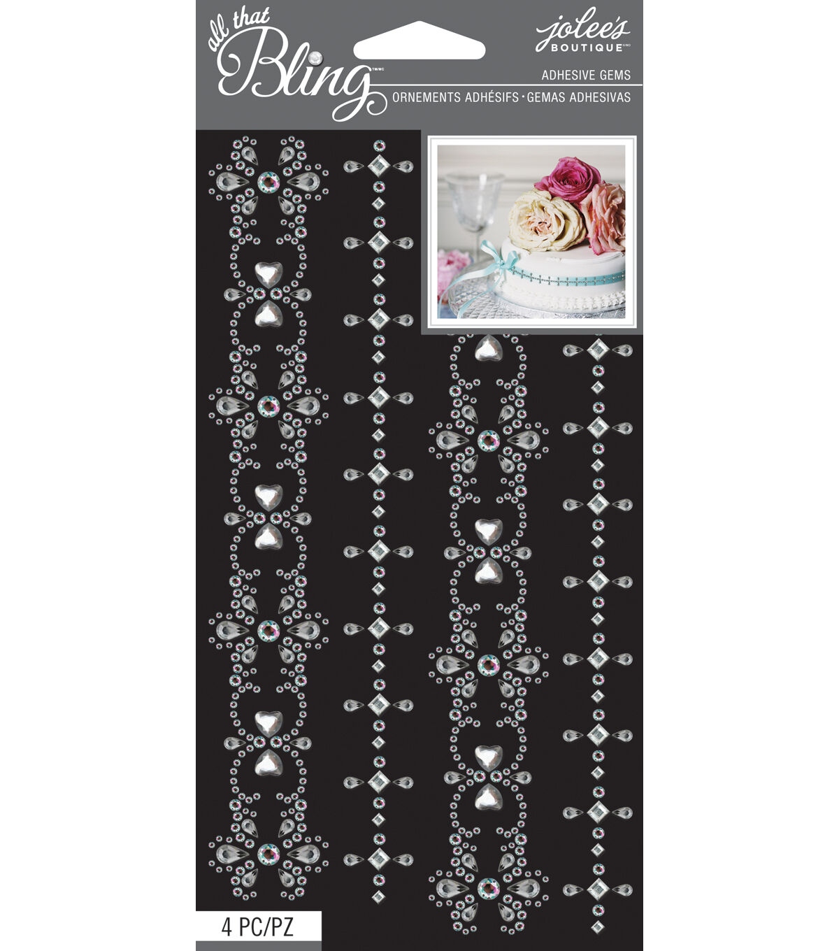 Personalize your wedding decor, accessories or other craft projects with the Jolee's Boutique All That Bling Clear Adhesive Gems. These sparkly border embellishments will add visual appeal to party or wedding invites, scrapbook layouts, greeting cards, gift wrappings and more. They are also easy to apply, with a self-adhesive backing that can be simply placed on the desired craft surface like paper, cardstock, felt or plastic, and gently pressed into place. This package contains four assorted adhesive gem embellishments.