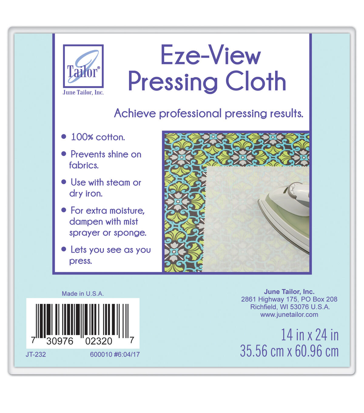 Press darts, hems, tucks, pleats and buttonholes with ease using the June Tailor Eze-View Cotton Pressing Cloth. This press cloth is made from superfine cotton, absorbs moisture evenly and prevents shine. It lets you see the fabric under it. You can use it with steam or dry iron. Dampen with a mist sprayer or sponge for extra moisture.
