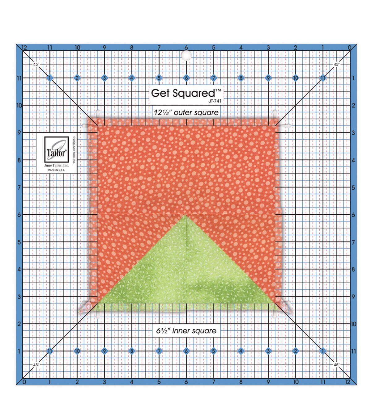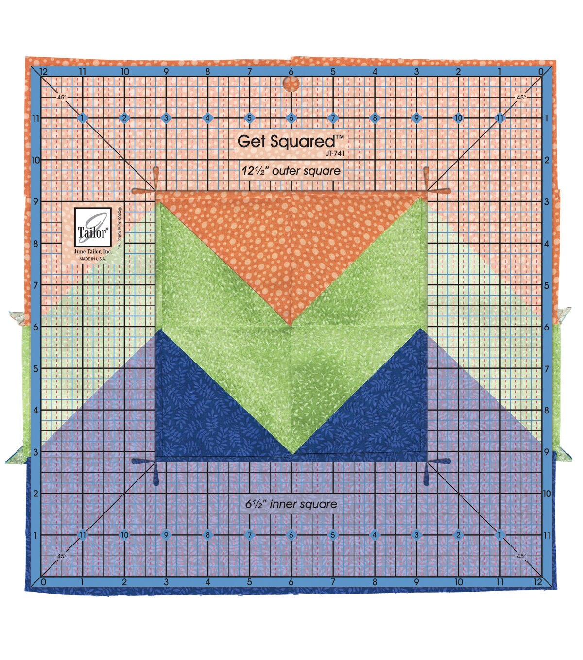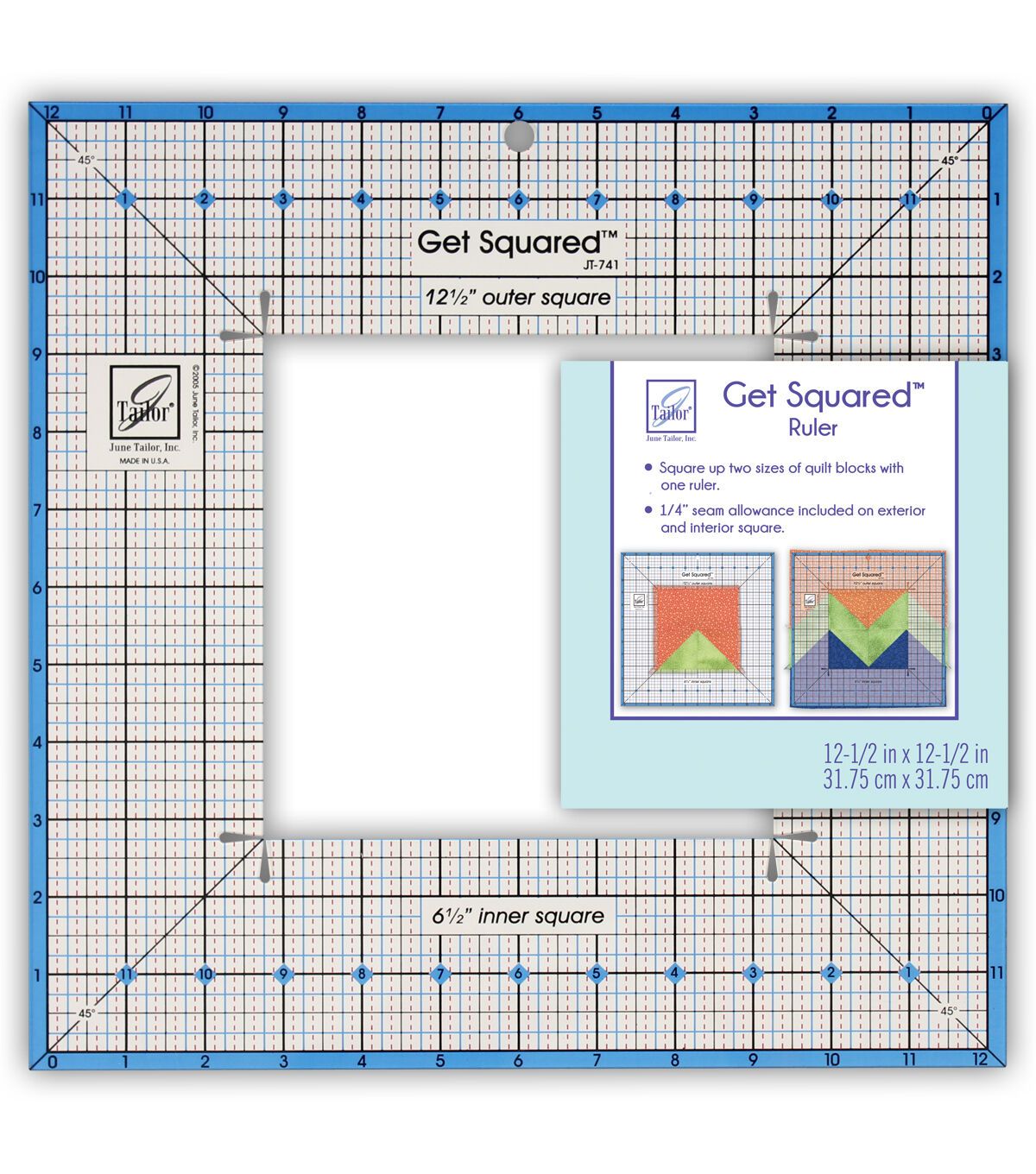 Create fun quilting projects with the June Tailor Get Squared Ruler. Use this squared ruler to get even edges on two sizes of quilt blocks. Simply use the rotary cutter along with a ruler to get perfectly sized blocks for your quilts. It comes with easy-to-read dimensions for better accuracy and alignment, and teardrops allow for a complete corner cut of the interior square. This ruler also allows seam allowances on both the interior and exterior.