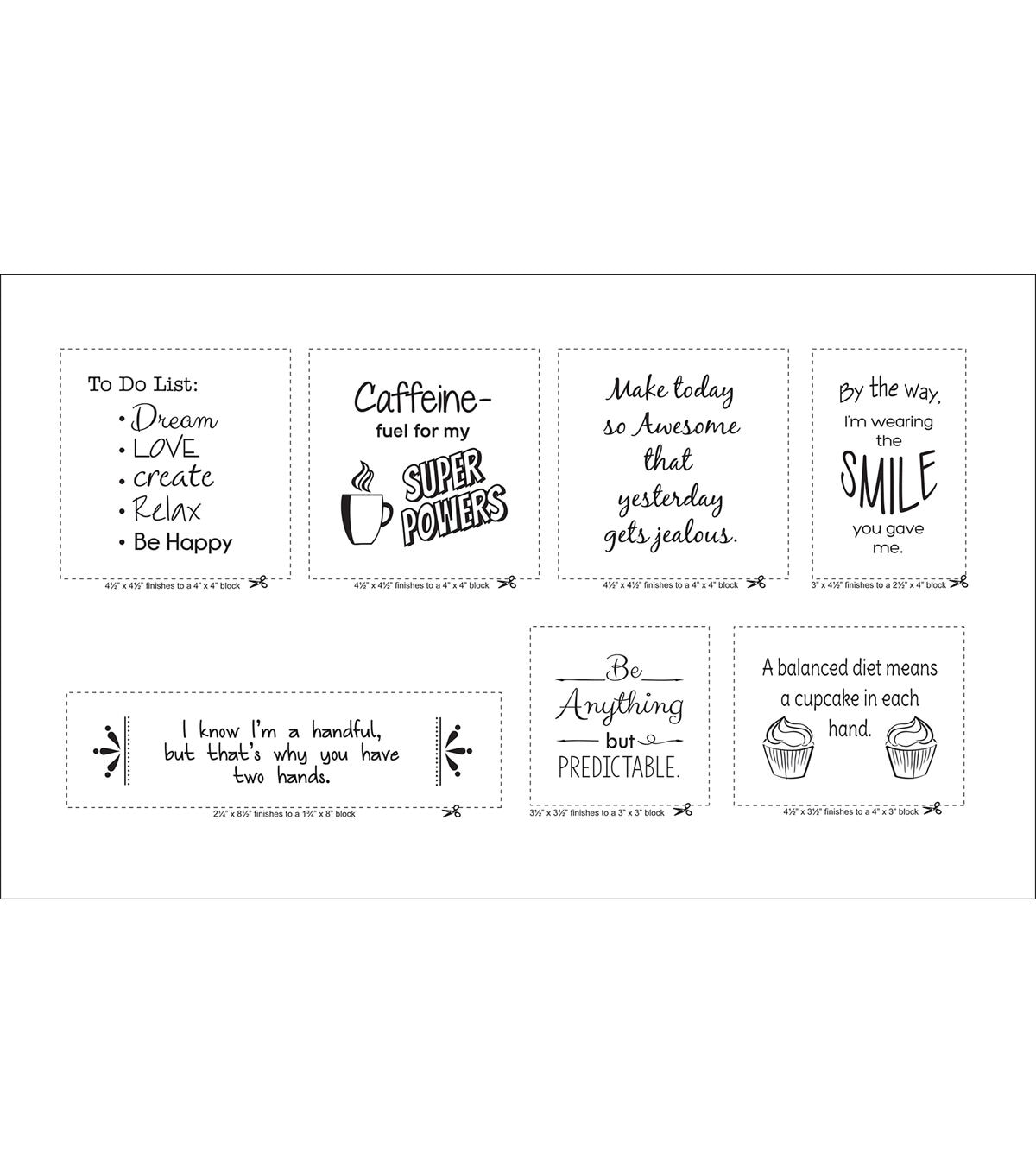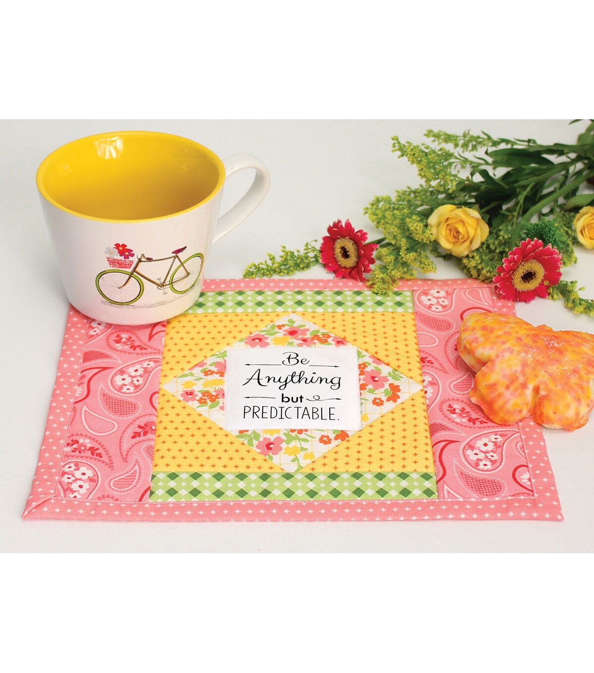 JUNE TAILOR-Quilt As You Go Inspirational Mug Mats Kit. Automatically quilt as you sew. This package contains seven printed statements on 100% cotton fabric, seven simple mug matt patterns on 80% cotton, 20% polyester batting and patterns. Approximate finished size: 8.5x10.5 inches. Made in USA.