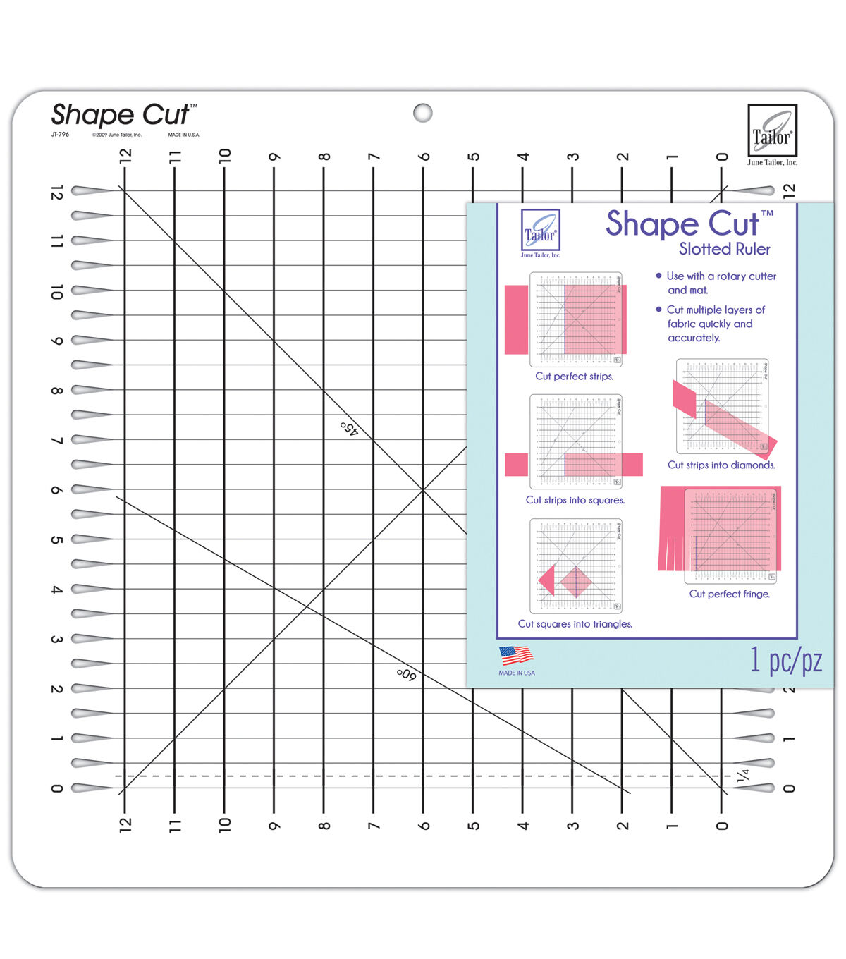 Cut various quilting shapes through multiple layers of fabric in precise increments using the June Tailor Shape Cut Slotted Ruler. This quilting ruler can be used to create strips, squares, triangles, diamonds or chevrons. Create fringe designs for your quilting projects with this handy slotted ruler. It is designed to work with a rotary cutter and rotary cutting mat.