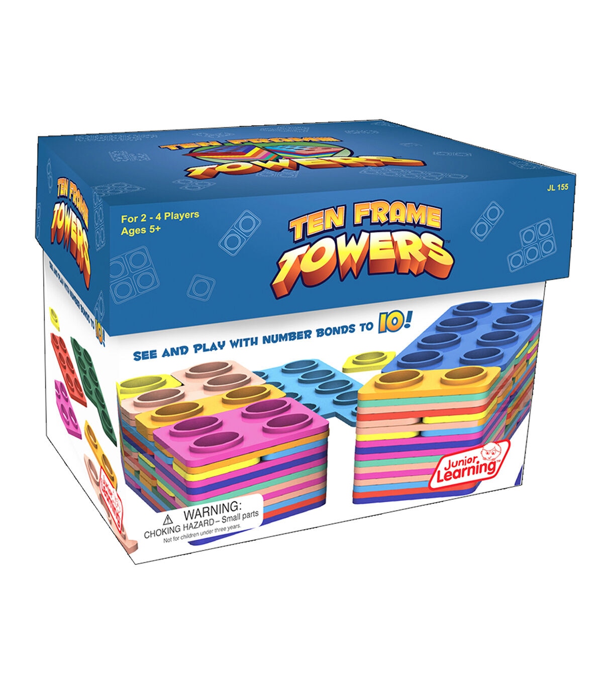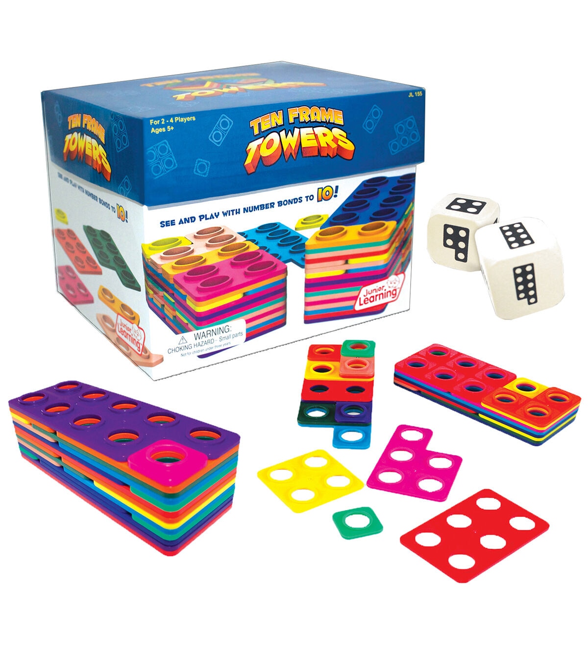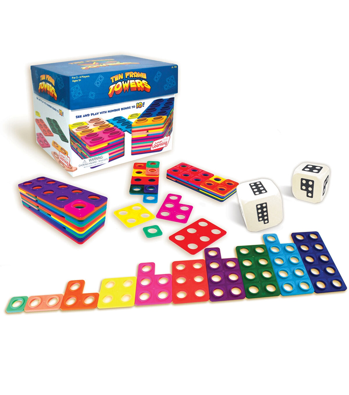 Roll the dice and stack as many Ten Frame number tile combinations as you can. The highest stacked tower wins! Build number bonds to 10 with the innovative stacking frames and develop arithmetic through multi-sensory learning. Helps students to quickly visualize numerals. Ages 5+, Grades K-2. 2-4 players. Includes 65 counting frame tiles, 2 foam dice, activity guide.