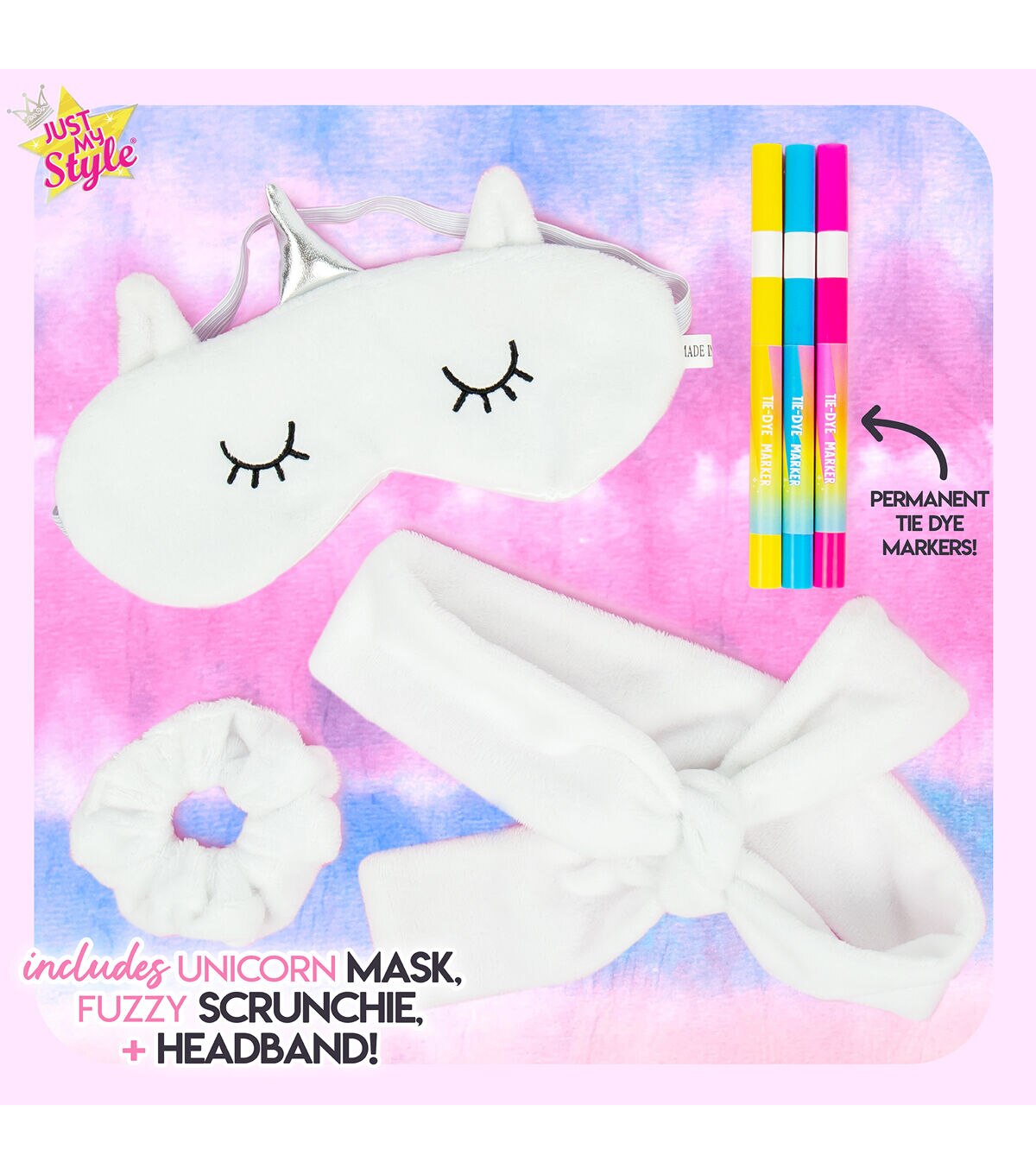- Kit Includes: 1 Fuzzy Eye Mask (White), 1 Fuzzy Scrunchie (White), 1 Fuzzy Fabric Strip Headband (White), 3 Tie-Dye Brush Markers (Blue, Pink, Yellow), Easy-to-Follow Instructions