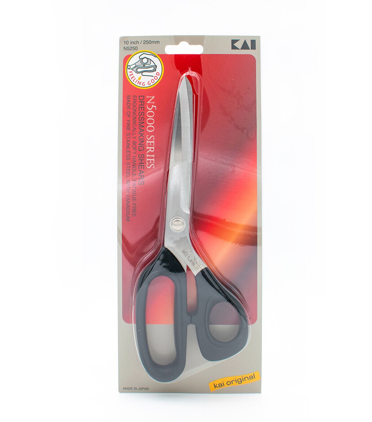 The KAI 5250 10'' scissor has ergonomically soft handles which allow fatigue-free cutting on all types of fabric. Heavy duty blades for a powerful cut. Larger handle grips to reduce stress for fatigue free cutting. The KAI 5000 Series scissors are made of a hardened stainless steel. The smooth, sharp blades give the Kai scissors an amazing smoothness in cut and feel.