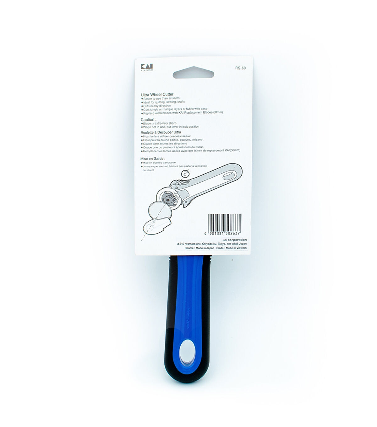 The KAI RS60 - 60mm Rotary Cutter has a comfortable, soft-grip handle with a pressure sensitive blade and safety lock feature. Universal grip for right or left-handed use. Most brand of blades will fit the KAI rotary cutters. The KAI RS-60 rotary cutter has an easy change blade system. No washers or springs to worry about, making this one of the most user friendly cutters on the market.