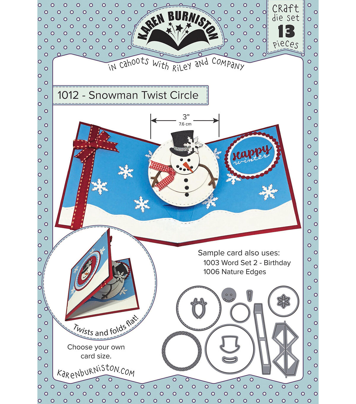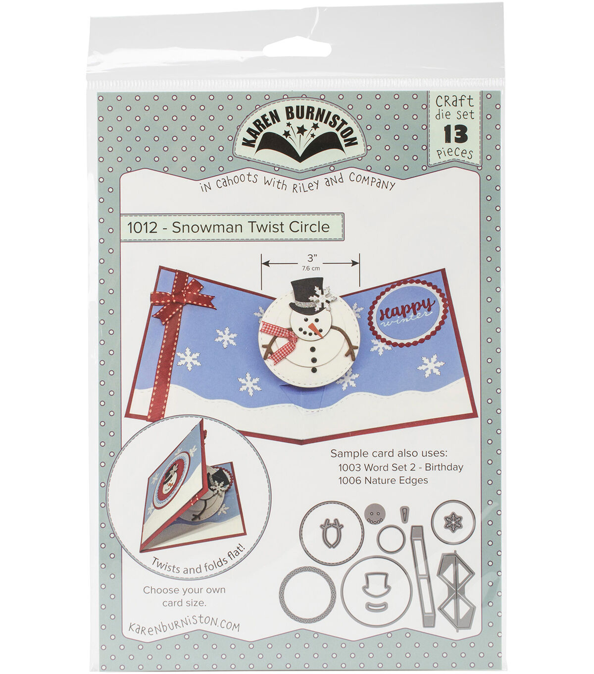 Karen Burniston dies will give an added touch to any paper project and are compatible with most die-cutting machines. This package contains thirteen metal dies measuring between .125x.5 inch and 3x3 inches . Design: Snowman Twist Circle Pop-Up. WARNING: Choking Hazard. Not suitable for children under 3 years. Imported.