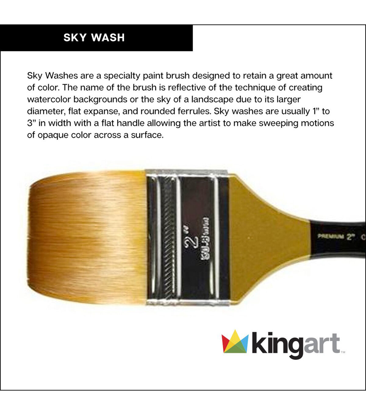 These beautiful Sky Wash brushes are part of the Original Gold 9000 Series. They have premium, Golden Taklon bristles that form a wide, flat base and come to a slightly tapered square edge. Each brush comes with a short, black and gold handle for maximum control when laying down large amounts of color and water. Especially ideal for watercolor applications.