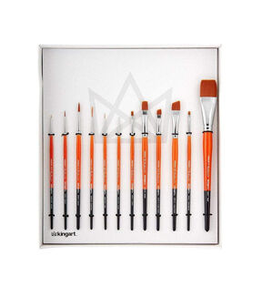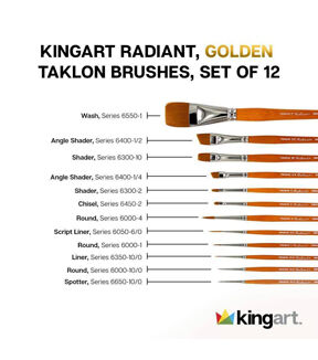 The KINGART Radiant Brush, 6000 Series is the ultimate universal brush designed for mixed media applications for all skill levels at a reasonable price. While the series has become a favorite of watercolor painting instructors and classes, these “workhorse” brushes are strong and durable enough for everyone from auto body shops and airplane manufacturers to ceramicists, decorative artists and calligraphers. The brushes’ fine points make them excellent for face painting and body art, with the ability to create beautiful strokes, dots, stars and even lines. The bristles, which are hand-crafted of high quality synthetic filament, easily withstand repeated use, always distributing paint evenly across skin. Radiant brushes feature an orange and black gloss finish handle with nickel-plated ferrules and “triple-dip” wooden handles. The “Triple-Dip” ensures additional sturdiness & durability as well as a modern design. The eco-friendly wood handles provide incredible balance for both close-up and longer distance painting. The brushes have smooth rounded edges along with our signature spring that is always found in KINGART Premium Brushes. Terrific for acrylics and all other mediums, Radiant Series Brushes 6000 are the best versatile paintbrushes.