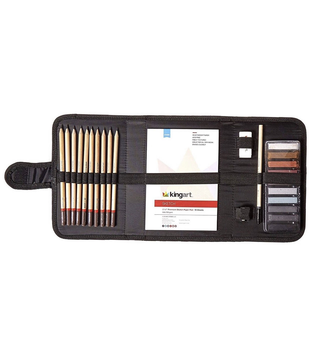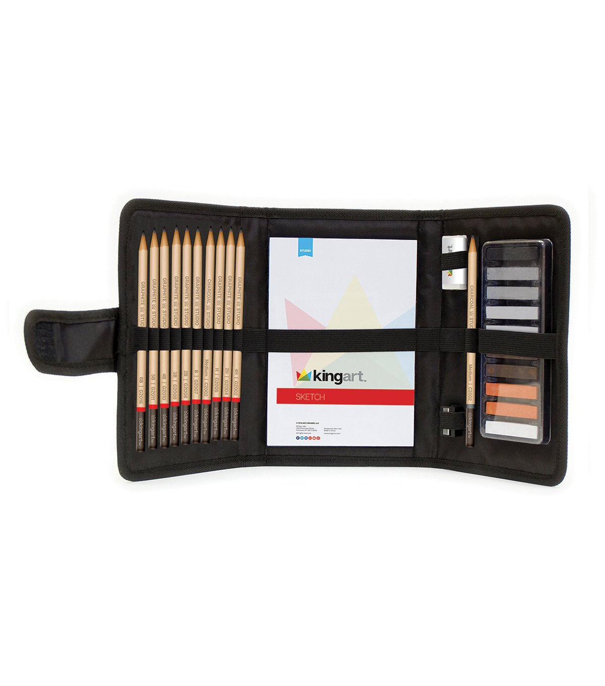 Open the sturdy nylon case and start sketching. You’ll find everything you need inside. A wide range of STUDIO sketching pencils, from the velvety soft 6B to the fine hardness of 4H. Plus 10 STUDIO soft pastels, rich with pigment, including five earth colors and five rich shades of gray.
