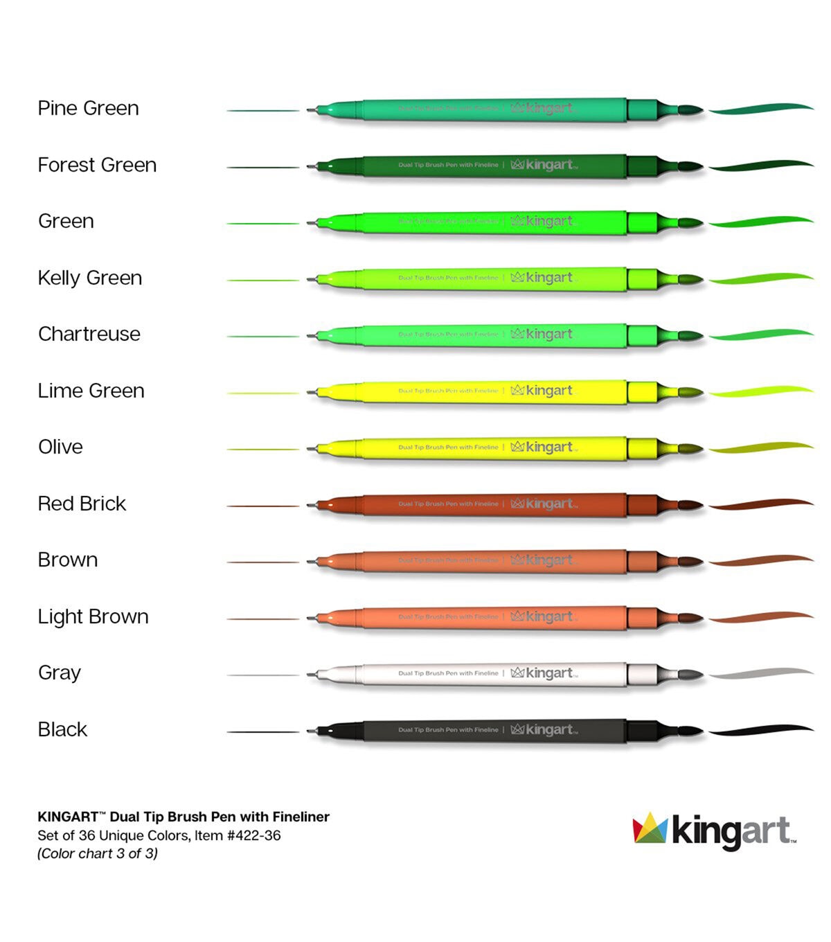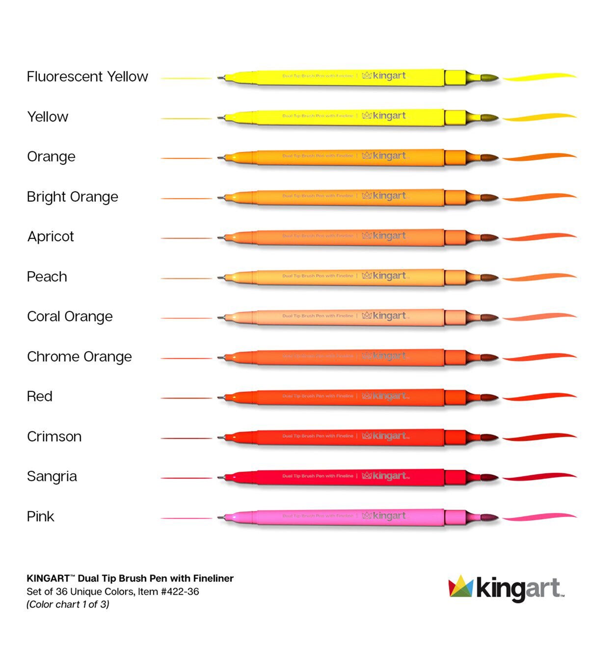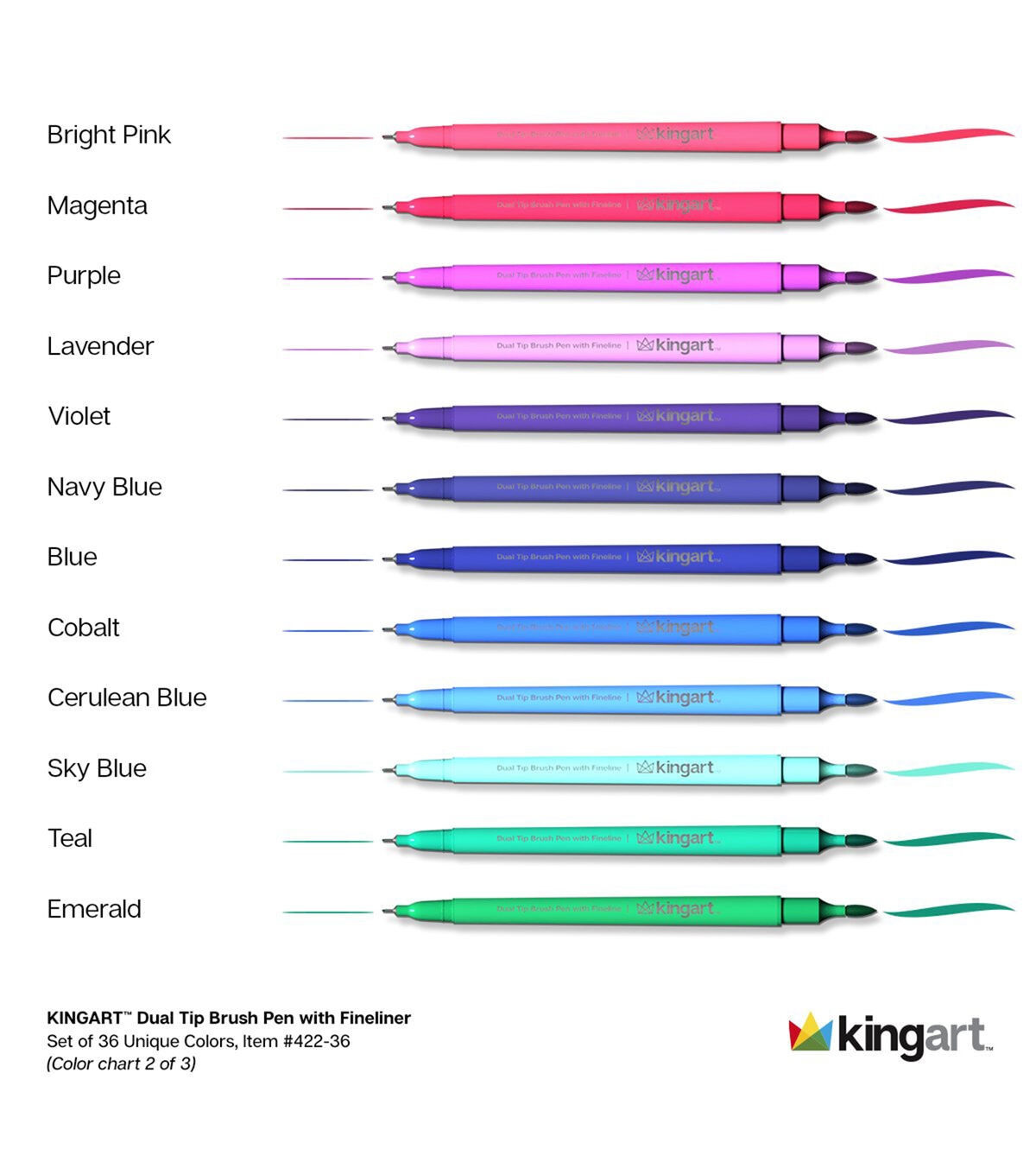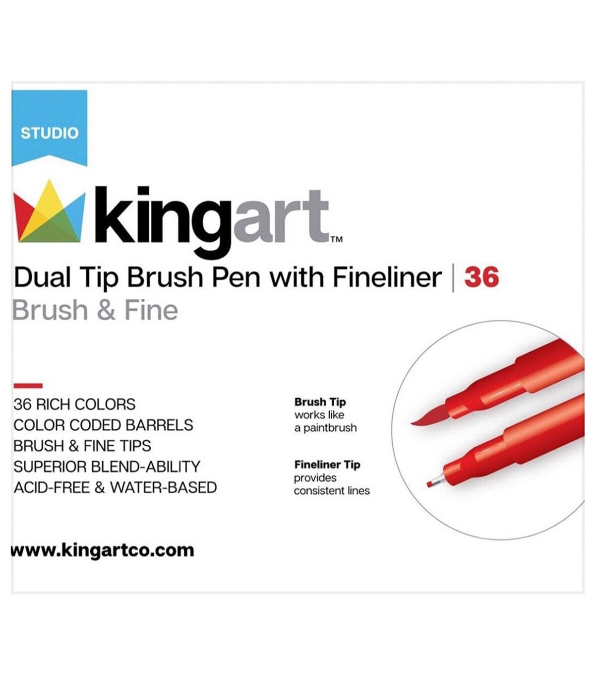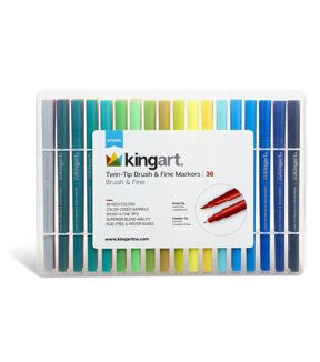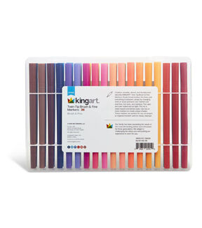 Creative, versatile, vibrant, and durable best describe KINGART STUDIO Dual Tip Brush Pens. Create broad strokes, fine lines, and everything in between, simply by changing ends or brush pressure. Our pens are acid-free, non-toxic, and odorless. The caps are color coded, air tight, and anti-roll. The ink is water-based and blends easily. Use two or more markers to create unique shades and the colorless blender pen for watercolor effects. use these pens for any art project or inspired moment–and no messy cleanup!
