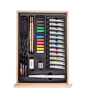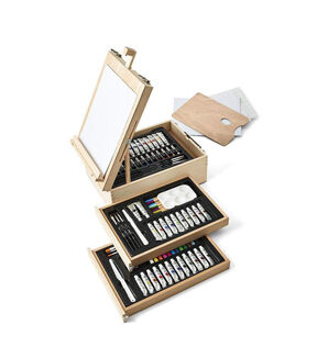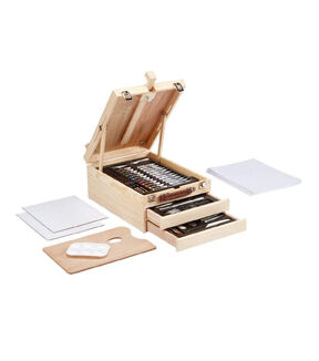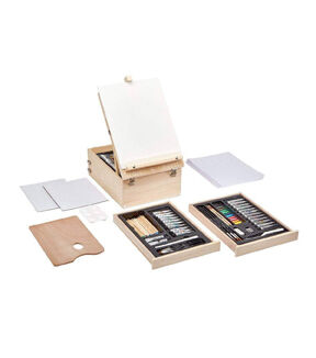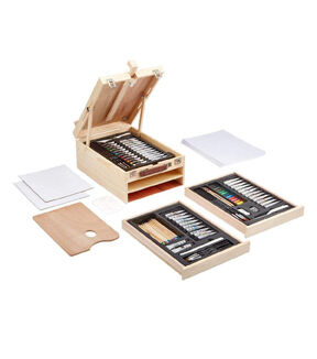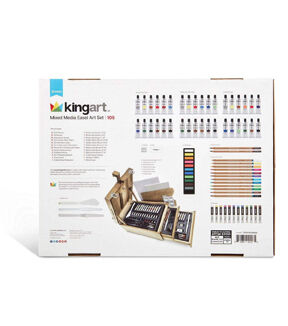 The KINGART STUDIO Mixed Media Easel Art Set is a perfect accessory for the artist on the go. Encased in a rich hardwood case is an array of supplies including paints, color sticks, pastels, a variety of graphite and watercolor pencils, and essential artist tools and surfaces to bring your creativity to life. The top of the storage case even props up to become a perfect tabletop easel wherever your inspiration takes you!