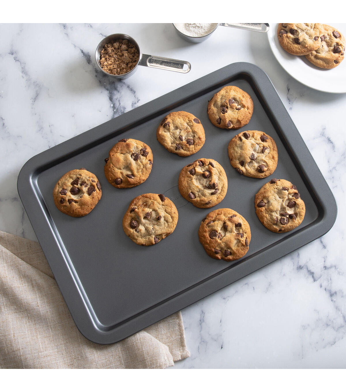 The Kitchen Details Nonstick Baking Sheet is perfect for all baking needs. The multi-purpose pan is great for baking cookies, roasting vegetables, heating up appetizers, or so much more. This baking sheet is made of durable carbon steel for long lasting use. The sheet conducts heat evenly for the best cooking results. The nonstick surface makes for an easy release and is also easy to clean. There is no need for cooking oil or sprays. The baking sheet has wide edges for easy gripping and carrying. This baking pan is oven safe up to 500 degrees Fahrenheit. The perfect pan for your kitchen.