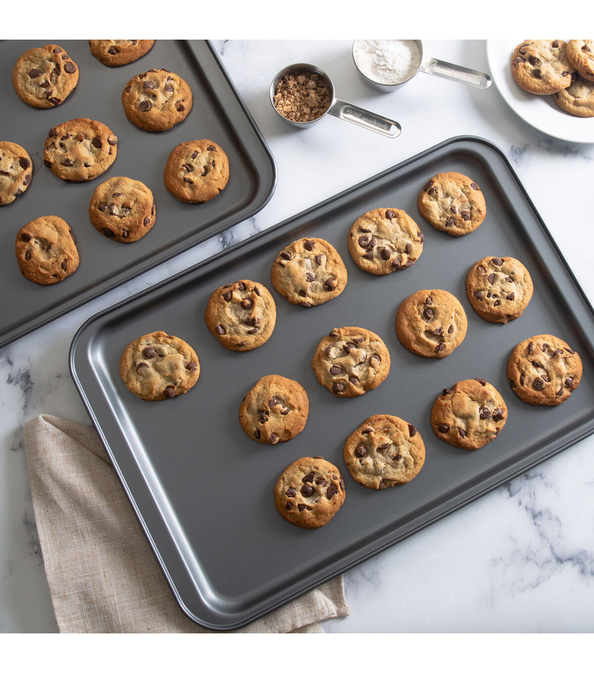 The Kitchen Details Nonstick Baking Sheet is perfect for all baking needs. The multi-purpose pan is great for baking cookies, roasting vegetables, heating up appetizers, or so much more. This baking sheet is made of durable carbon steel for long lasting use. The sheet conducts heat evenly for the best cooking results. The nonstick surface makes for an easy release and is also easy to clean. There is no need for cooking oil or sprays. This baking pan is oven safe up to 500 degrees Fahrenheit. The perfect pan for your kitchen.