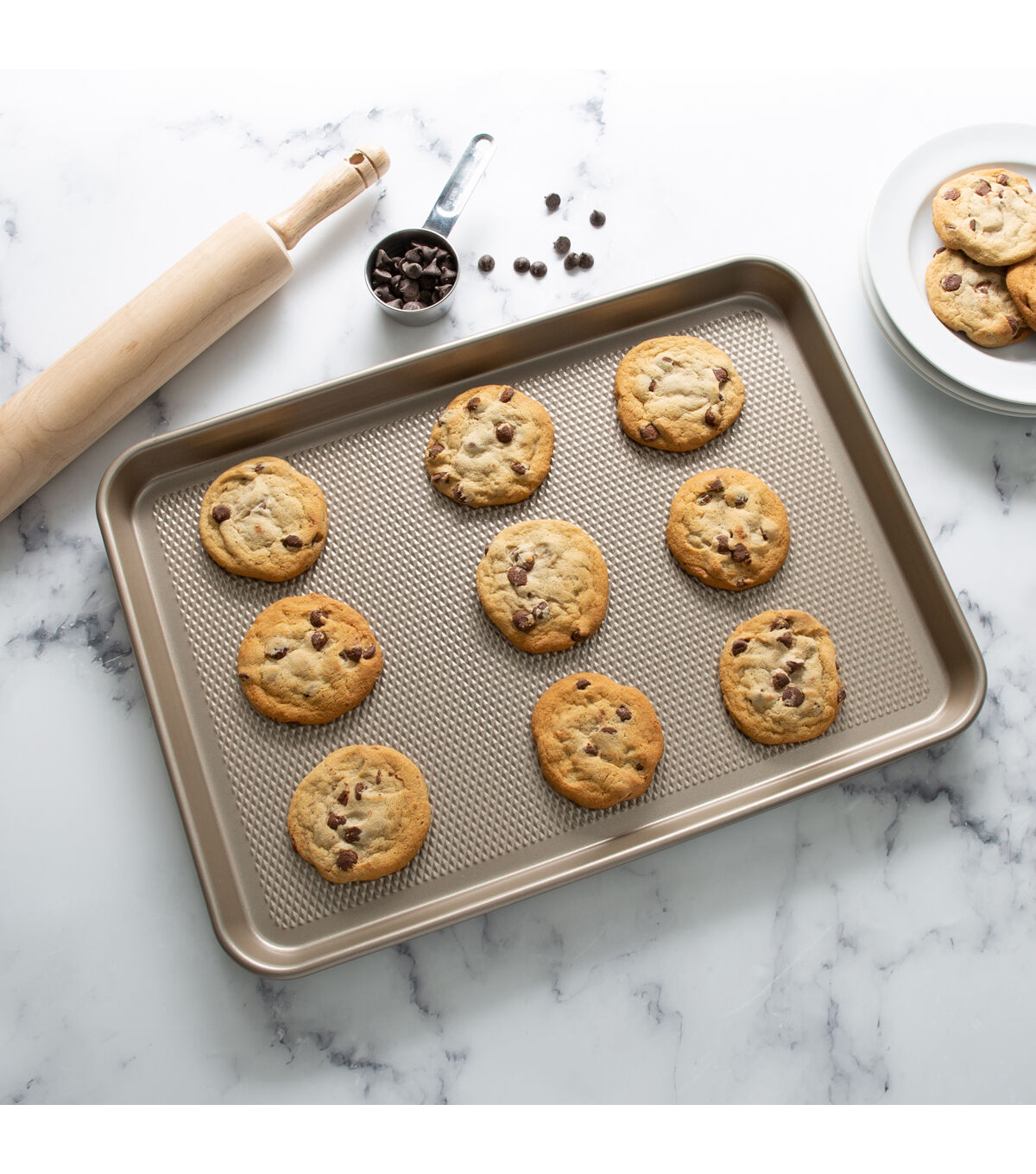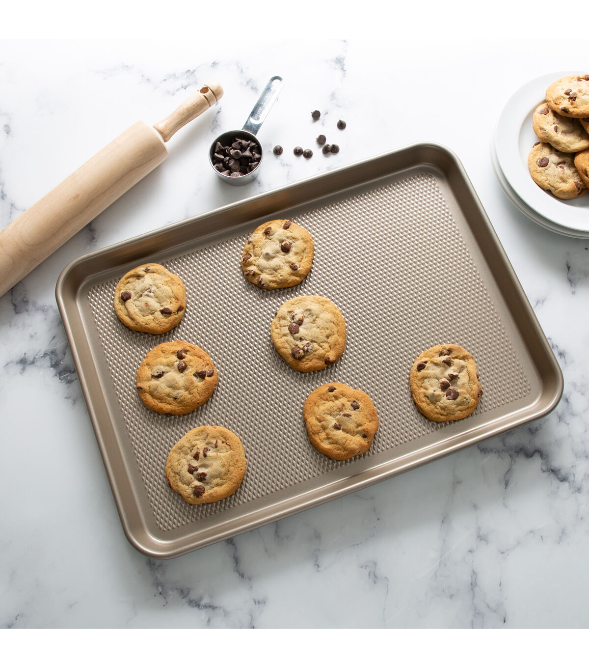 The Kitchen Details Pro Series Nonstick Baking Sheet is perfect for all baking needs. The multi-purpose pan is great for baking cookies, roasting vegetables, heating up appetizers, or so much more. This baking sheet is made of durable carbon steel for long lasting use. The textured diamond base of the sheet conducts heat evenly for the best cooking results. The nonstick surface makes for an easy release and is also easy to clean. There is no need for cooking oil or sprays. This baking pan is oven safe up to 500 degrees Fahrenheit. The perfect pan for your kitchen.