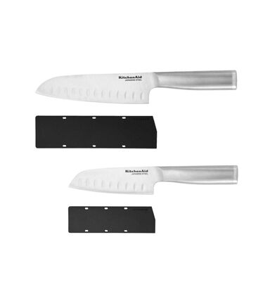 Santoku knives from KitchenAid are an everyday must for meal prep. Ridges on blades specially designed to prevent foods from sticking. Forged semi-polished Japanese steel blade is hardened and tempered for lasting sharpness. Ergonomic handle offers stability and control. Comes with custom fit blade covers for safe storage. Dishwasher safe but hand wash recommended. Includes 5" Santoku and 7" Santoku knives with covers.