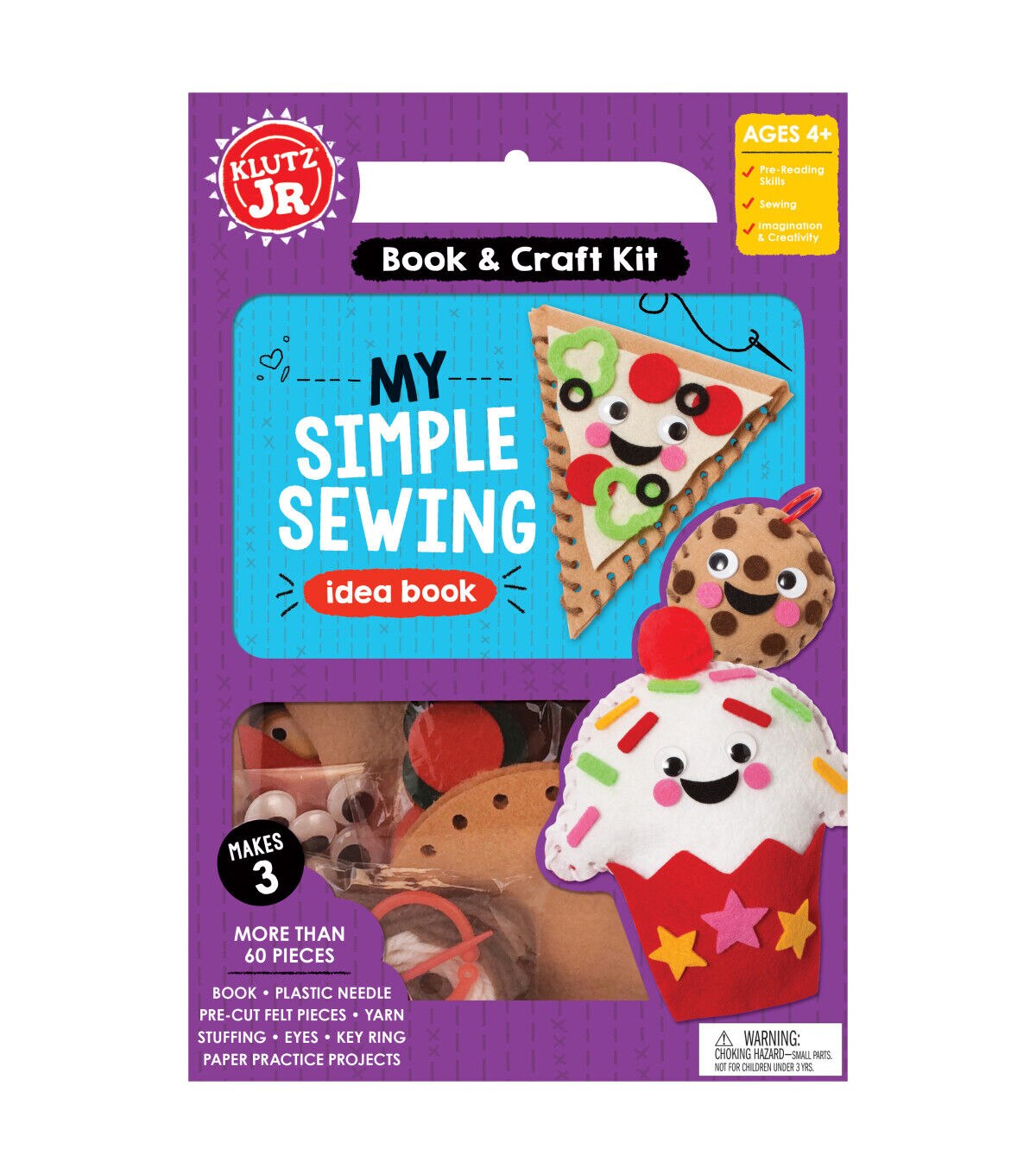 This kit helps to build fine motor skills and teaches how to sew! Little makers will start by practicing on two cardstock practice projects using a plastic needle safe for small hands. Using the pre-cut and pre-punched felt, kids will create three cute projects (pizza pouch, cookie keychain and cupcake plushy). This set includes 59 precut felt pieces, custom plastic needle safe, two sets of sewing cards, two colors of yarn, five pink foam yarn stoppers, a red pom-pom, a key ring and stuffing.