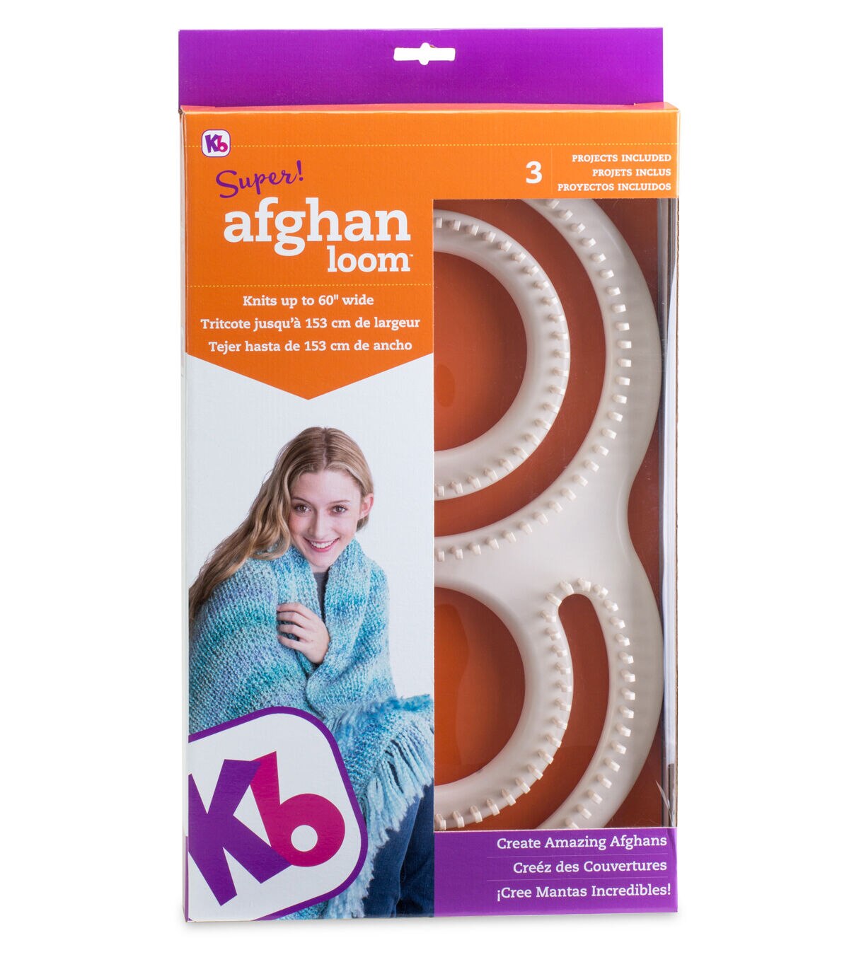 AUTHENTIC KNITTING BOARD- 60" Wide Afghan Loom. No knitting experience needed, complete step-by-step instructions. Make an afghan all in one piece with this Super Afghan Loom! This package contains one afghan loom with 198 pegs; detailed instructions for three projects and a knit hook. Imported.