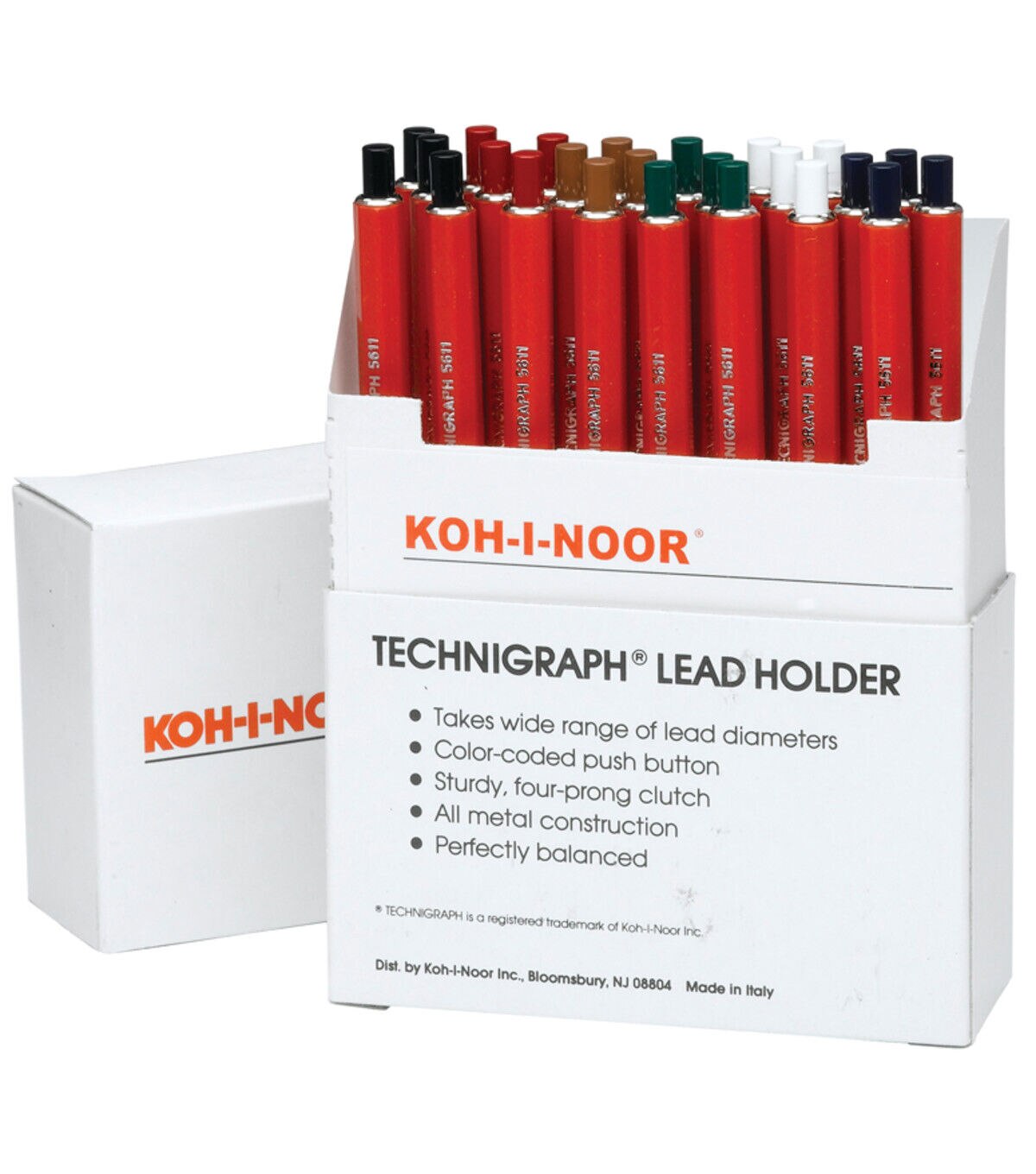 This all-metal, perfectly balanced lead holder takes a wide range of lead diameters - essentially four tools in one! The barrel features color-coded push-buttons for lead degree identification so you can switch back and forth with ease. The 4-prong clutches hold leads firmly without slippage.