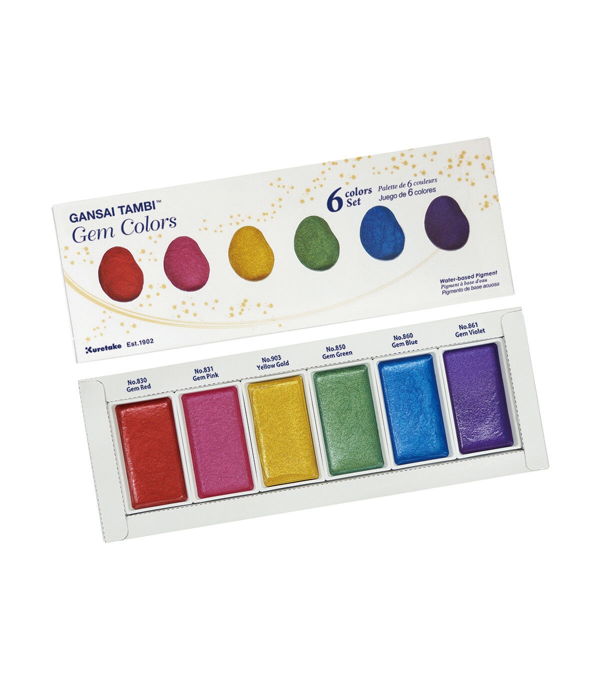Use Gansai Tambi watercolors to create artwork with beautiful, luminescent colors. The pigment is both dense and homogenized; each stroke of color goes a long way, offering smooth, even color. Each watercolor pan contains a bright, dazzling hue that adds intrigue, depth and interest to your artwork. This set contains pans of gem red, gem pink, yellow gold, gem green, gem blue and gem violet.