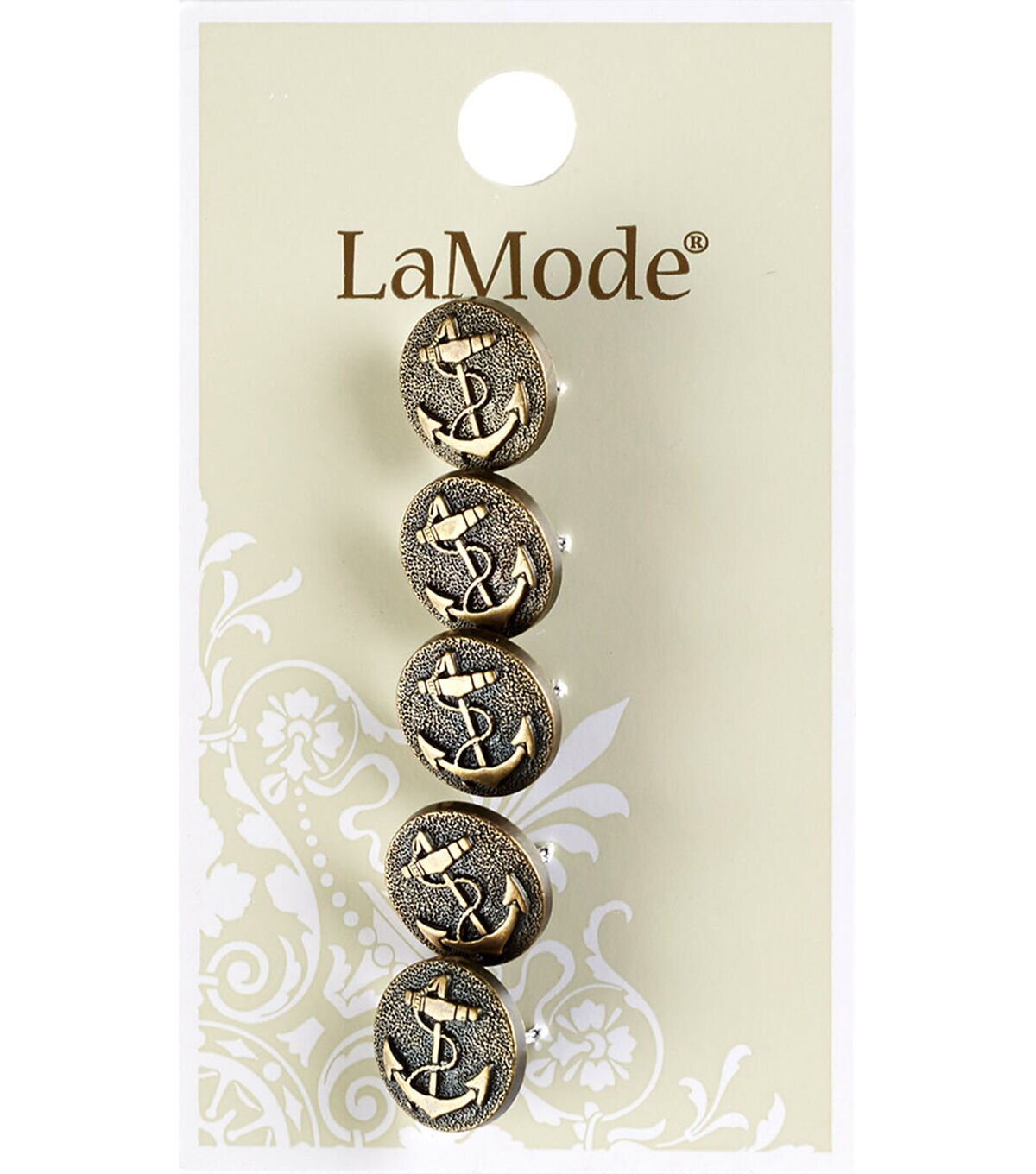 Add a stylish and elegant touch to DIY sewing creations using the La Mode Buttons Antique Gold Anchor. These antique gold-toned shank buttons sport an embossed pattern of an anchor for a distinctive look. You can also pair them with colorful button embellishments, sold separately, and add them to your crafting projects.