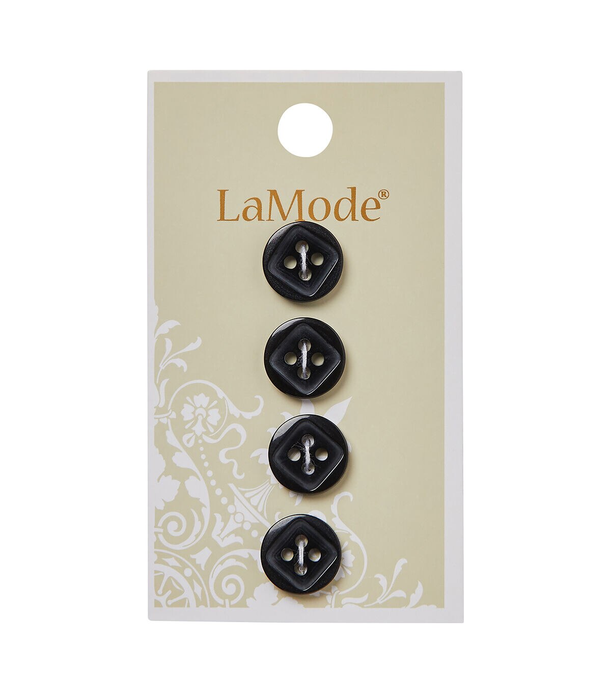 The La Mode 4 Hole Buttons - Black will give your handmade creations a new look. These buttons sport a black hue and will be perfect for fastening purposes. You can add them to shirts, tops, dresses and more. Team them with other colorful buttons, sold separately, to embellish aprons, headbands and wallets.Brand: La Mode Collection: Apparel Buttons Includes four buttons Size: 0.5 inch Care: Washable & dry cleanable