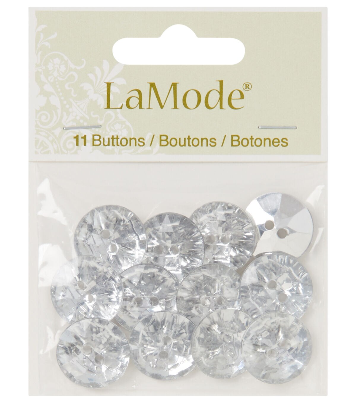 Add a unique touch to your handmade creations with the La Mode Gem 2 Hole Buttons - Clear. These faceted buttons display a silver tone and resemble gemstones. You can stitch them onto plain jackets, sweaters, dresses, tops and more to give them a glamorous touch. This pack contains 11 buttons.