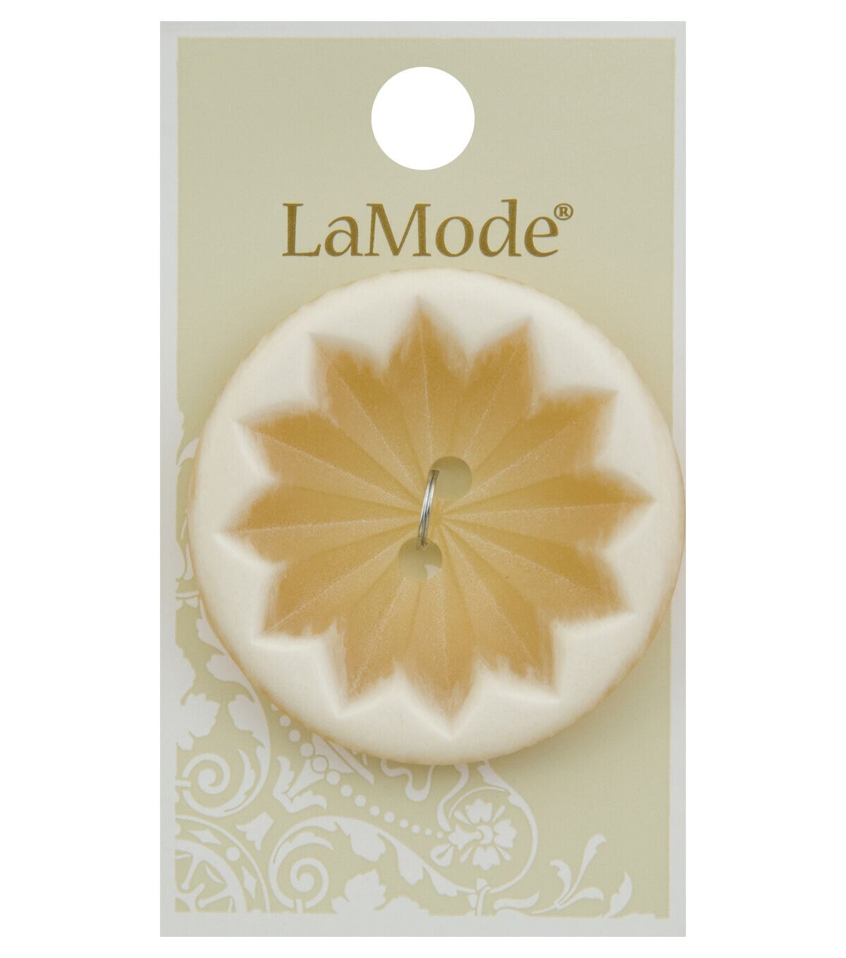Lend a unique and attractive touch to your apparel and other home decor creations using the La Mode Round Button Tan Starburst. Add this decorative button to skirts, cushion covers, kitchen aprons and accessories for an appealing look. You can also use it to accentuate papercrafting projects.Brand: La Mode Collection: Apparel Buttons Size: 1.75 inches Content: Polyester Care: Washable & dry cleanable