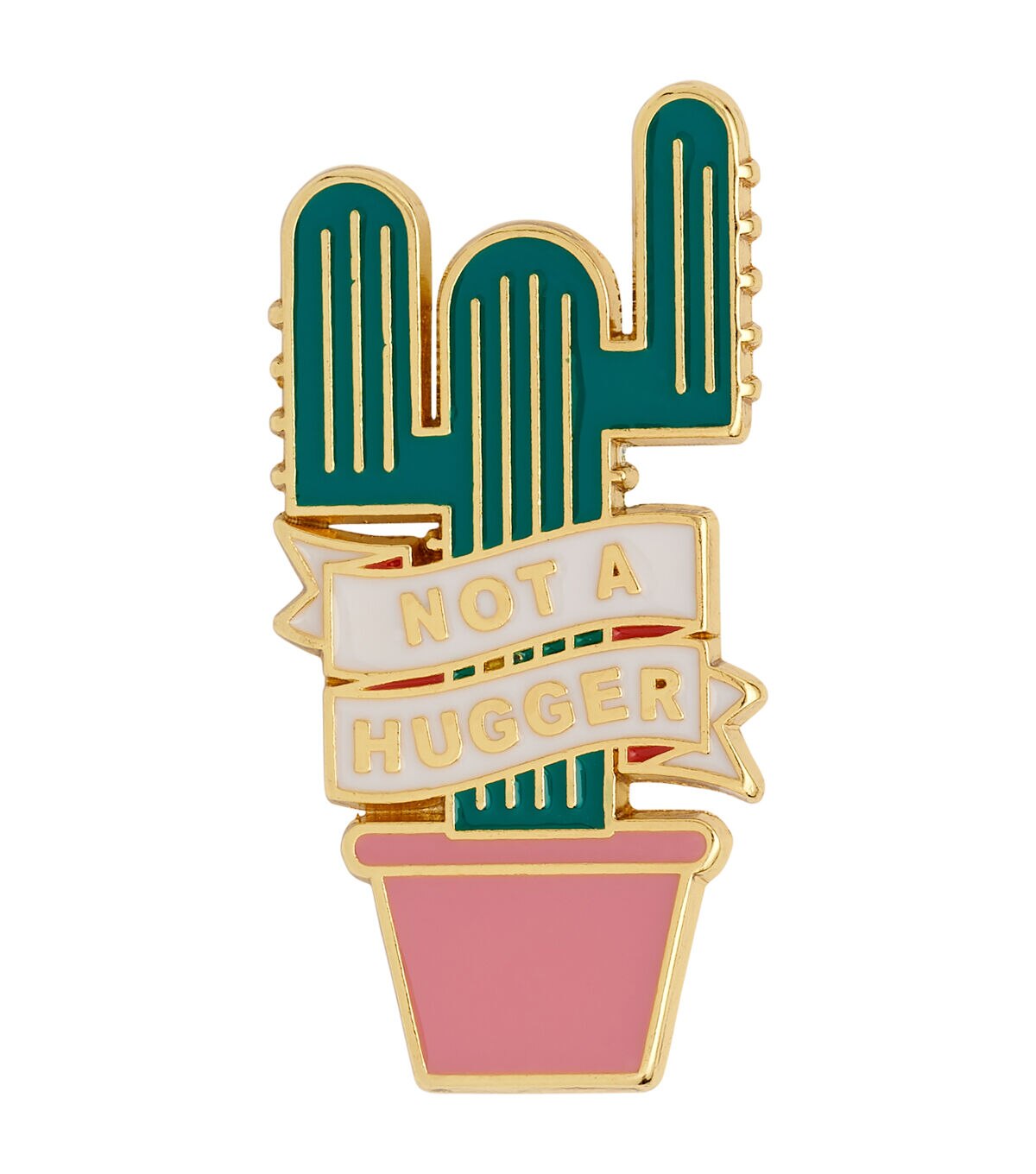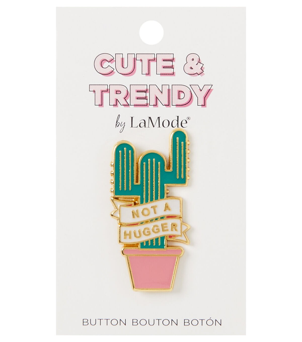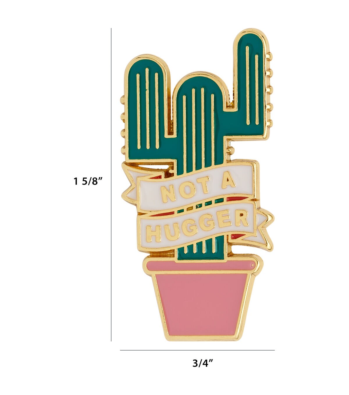 The La Mode Cute & Trendy Not A Hugger Shank Button - Multi is just what you need to add a fun touch to a simple dress or tee. This button is shaped like a cactus in a pot with a ribbon in front that flaunts the phrase ‘Not a Hugger.’ The gold-toned border adds to its charm. You can also use it to accentuate a tote bag or backpack.