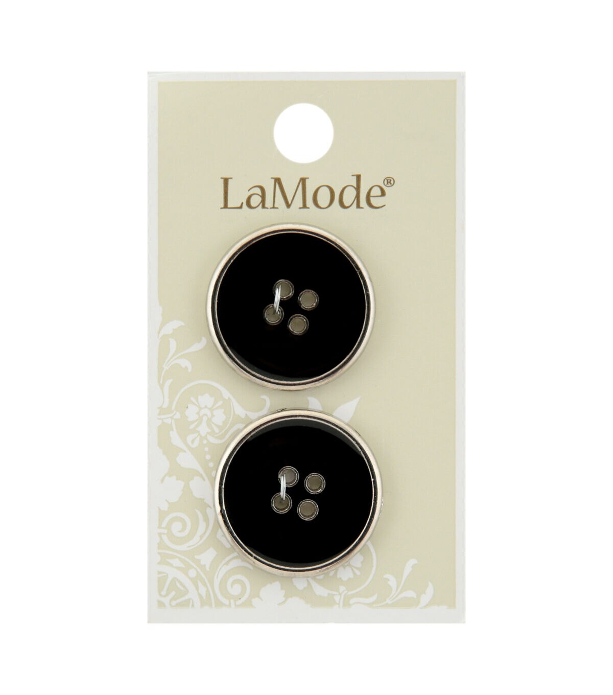 These La Mode Black 4 Hole Buttons with Silver Rim are ideal for sewing, crafting and fashion projects. The 25 mm sew-through buttons come in a pack of two.