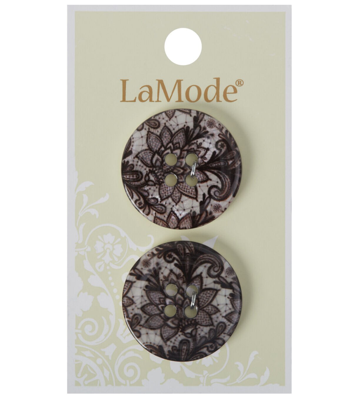 Simple yet attractive, the La Mode 4 Hole Buttons - Black Lace on White are just what you need to accentuate your apparel projects. These sew-through buttons sport a white shade and a lovely lace pattern in a black hue. They will be perfect to add visual appeal to coats, jackets, dresses and skirts.