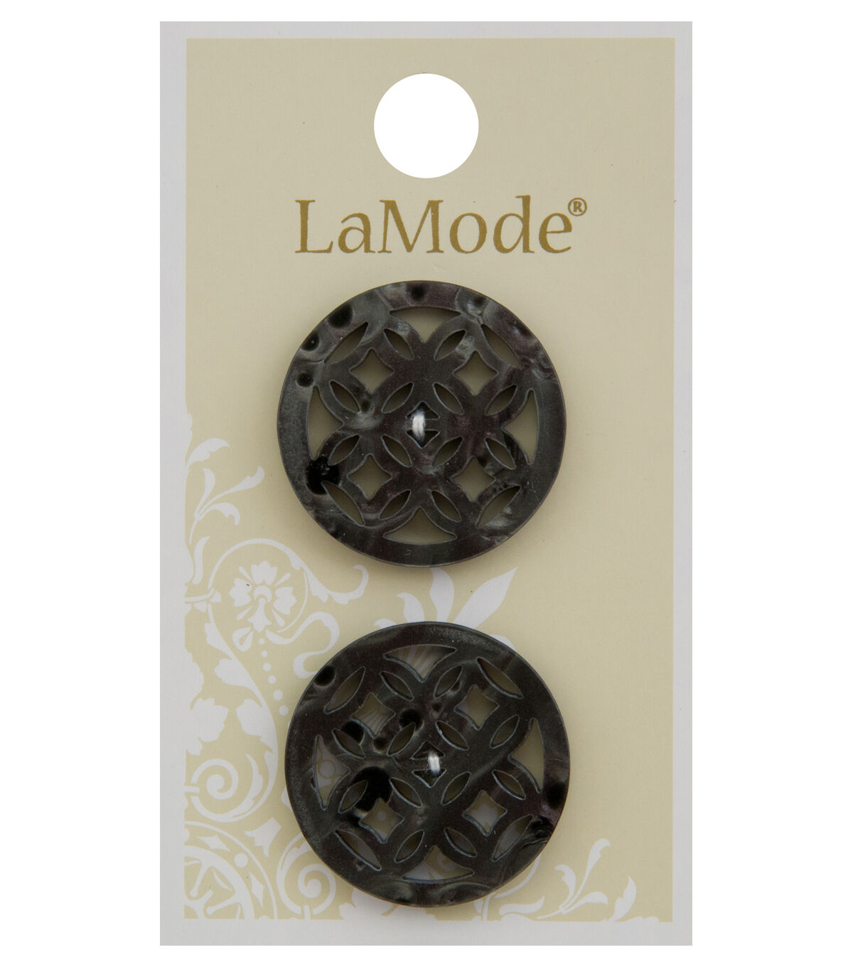 Blending beauty and functionality, the La Mode 2 Hole Buttons - Pearlized Black will make a great addition to your sewing kit. These buttons display a beautiful cutout design and will make your handmade creations stand out. You can add them to a DIY sweater, dress, top and more. This pack contains two buttons.