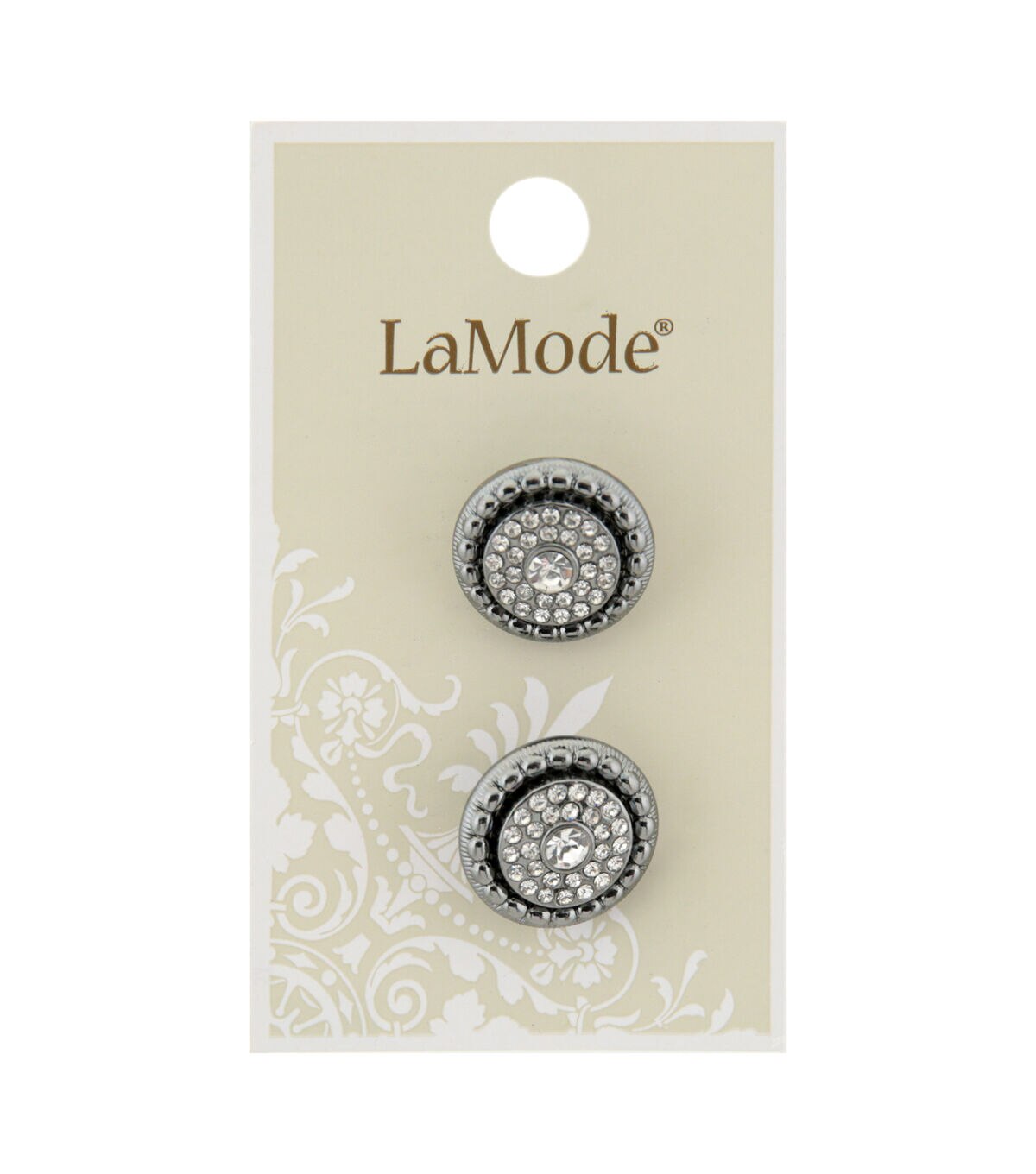 These La Mode Gunmetal Shank Buttons with Clear Rhinestones are perfect for everyday sewing, crafting or fashion projects. The 18 mm shank buttons come in a pack of two.