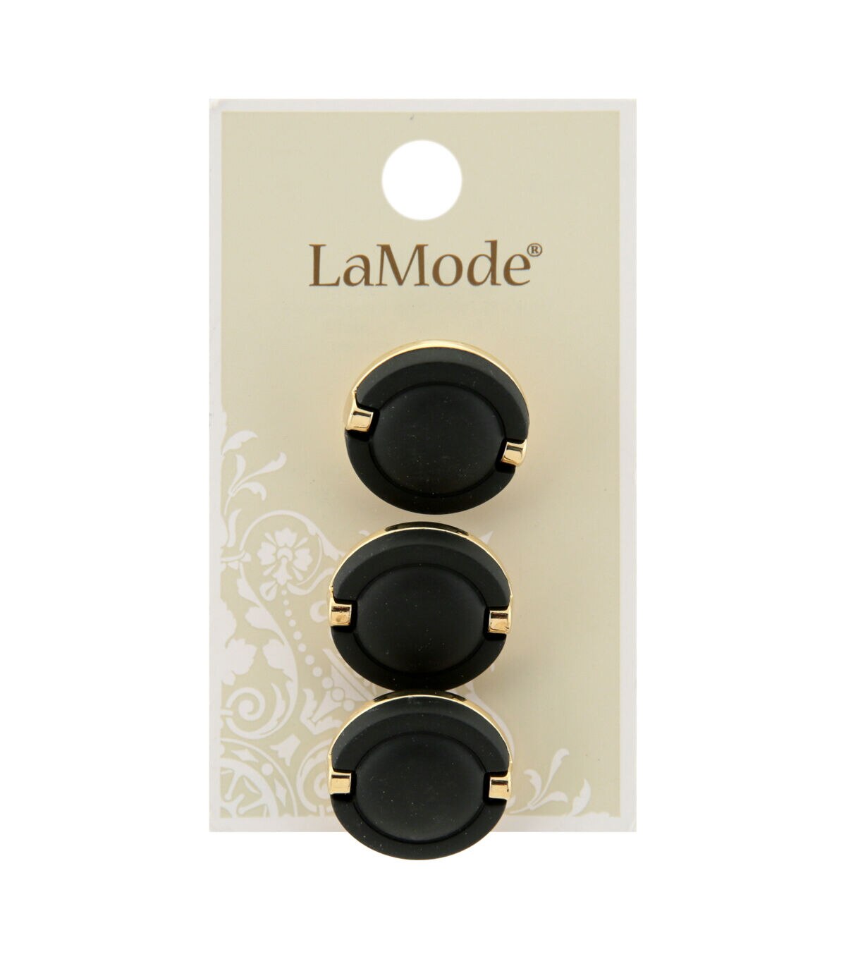 These black with gold accent La Mode Shank Buttons-Black & Gold are perfect for sewing, crafting and fashion projects. The 20 mm shank buttons come in a pack of three.