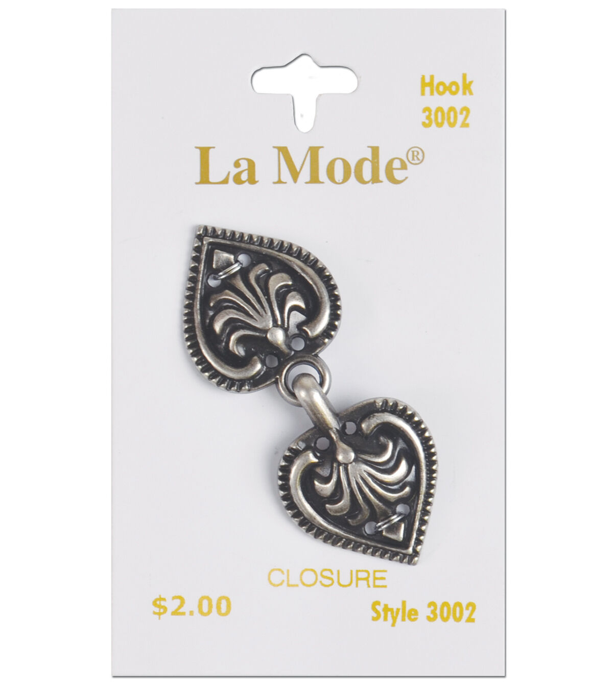 The La Mode Clasps/Buckles Matte Antique Silver will make a lovely addition to your sewing accessories. This clasp flaunting a silver tone comes in a unique shape and is beautifully detailed. It can be used in a range of craft or sewing projects including jackets, capes and purses.Brand: La Mode Collection: Apparel Buttons Includes two pieces per clasp Size: 2 inches Care: Washable & dry cleanable