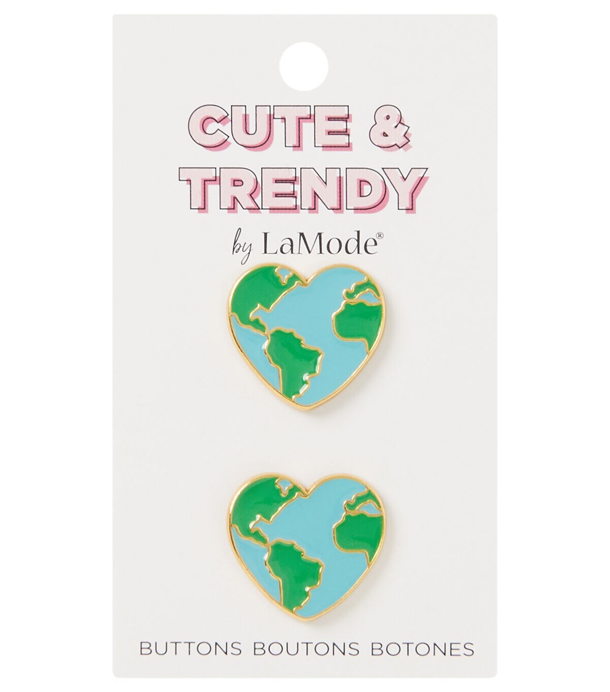 Simple yet pretty, the La Mode Cute & Trendy Earth Heart Buttons - Blue & Green will make a delightful addition to your sewing supplies. These buttons are shaped like a heart and sport the print of the Earth in blue and green shades. A gold-toned rim completes them. You can stitch them onto dresses, tops, sweaters and more.