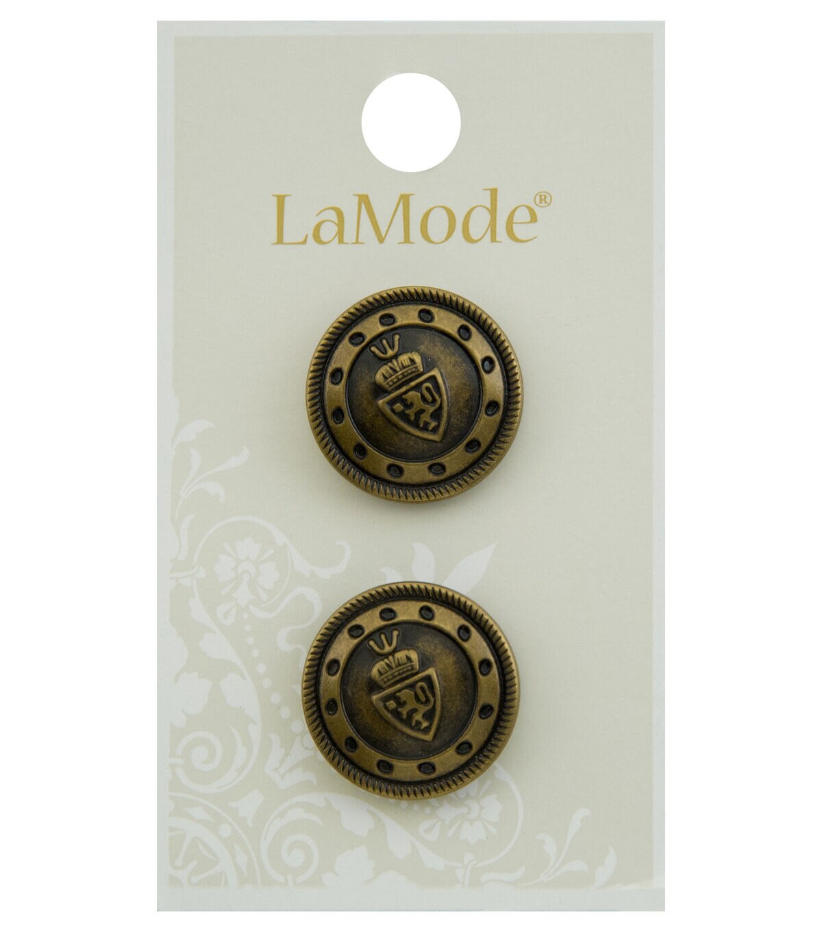 The La Mode Round Shank Buttons Gold will make a great addition to your craft collection. With a gold tone and an antique pattern, these buttons will lend a unique look to your handmade creations. They can also be added to sweaters, jackets, coats, fabric bags and more. Brand: La Mode Collection: Apparel Buttons Includes two buttons Size: 0.75 inch Content: Metal Care: Washable & dry cleanable