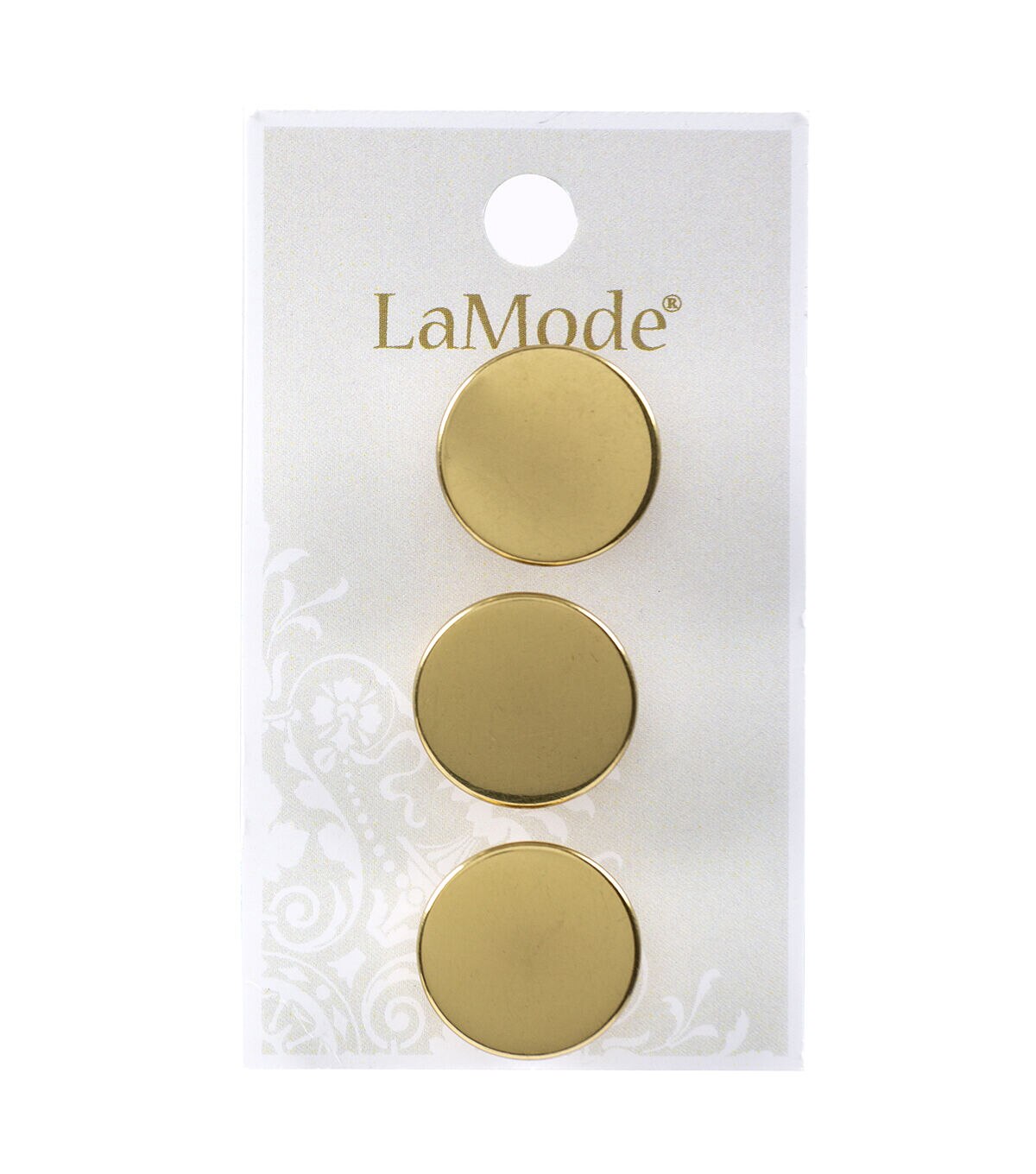 The La Mode Shank Buttons - Gold will make a great addition to your sewing accessories. Stitch them onto a black or white top or dress or use them to embellish your handmade tote bag. This pack contains three buttons sporting a rich gold-toned finish.Brand: La Mode Collection: Apparel Buttons Includes three buttons Size: 0.75 inch Care: Washable & dry cleanable