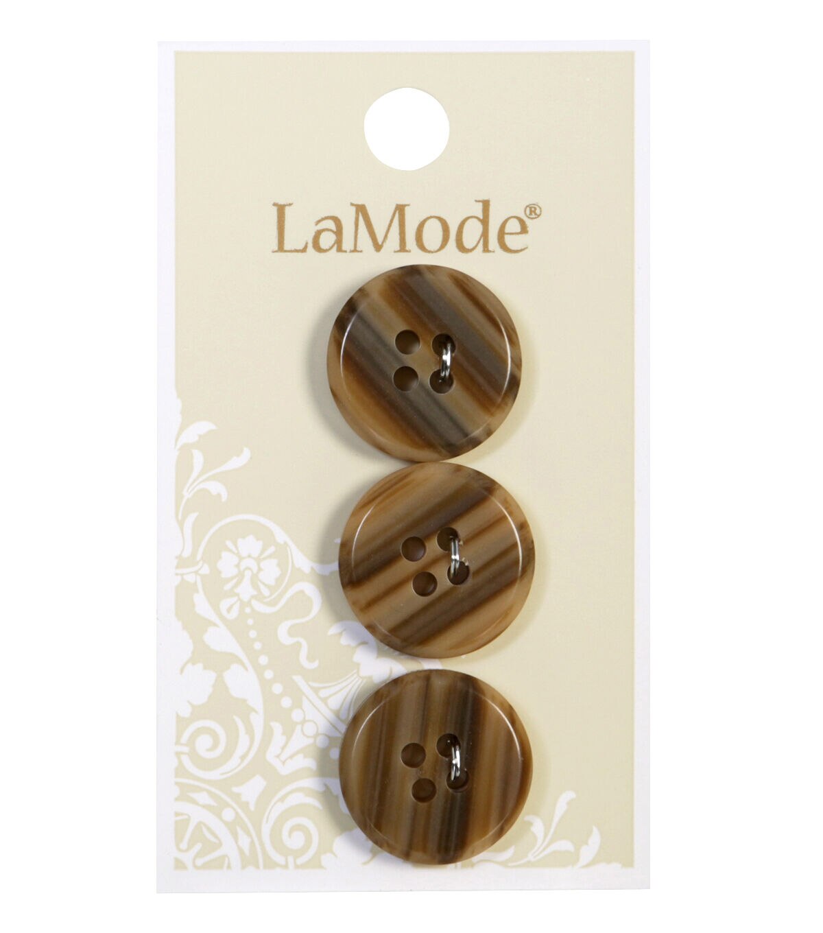 The La Mode Buttons - Tan Stripes will make a great addition to any sewing kit. These round buttons sport a tan hue and striped pattern. They are easy to use and will complement apparel of all styles and colors. You can add them to formal dresses, shirts, sweaters and more. This pack consists of three buttons.