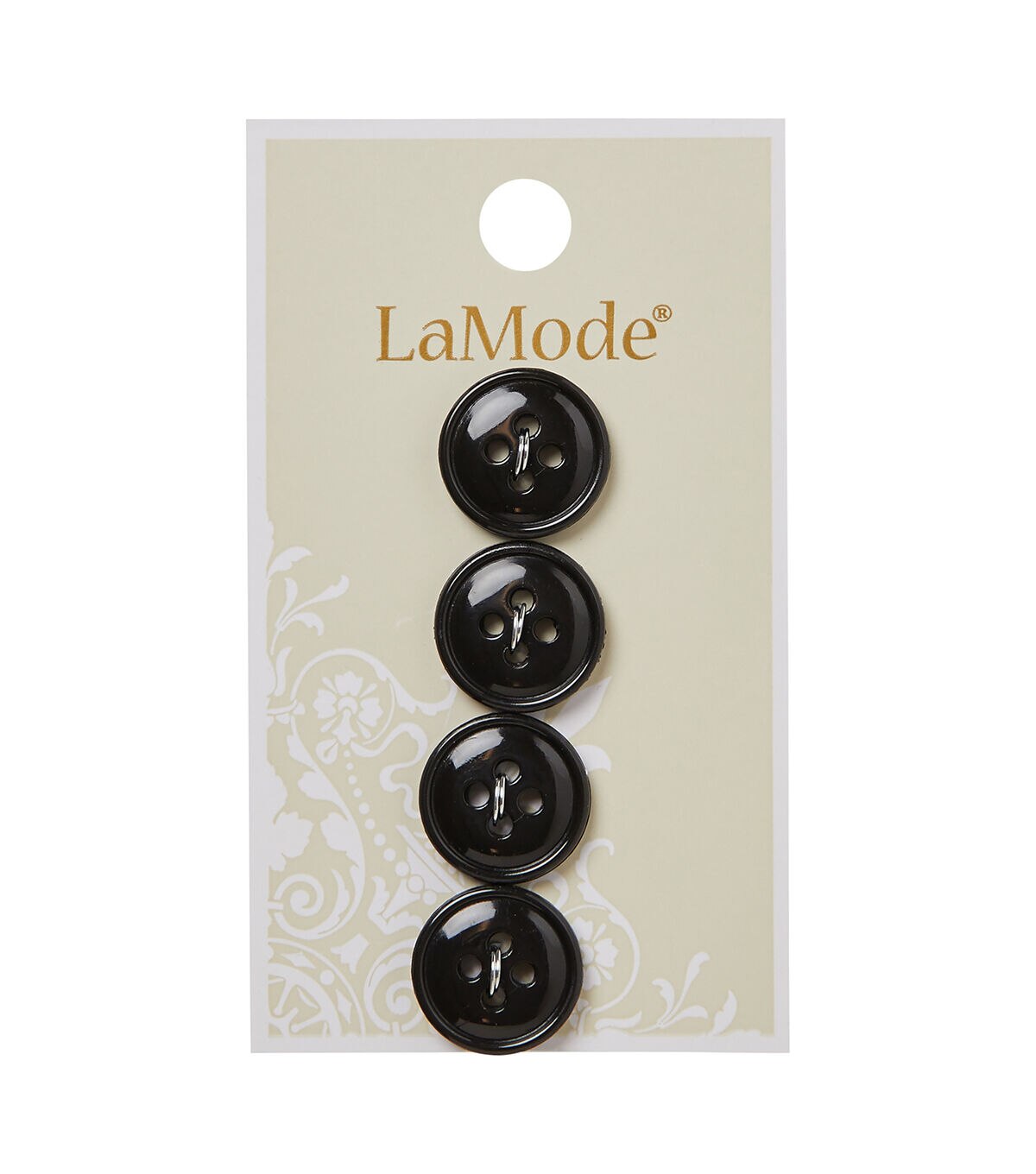 The La Mode Black 4-Hole Buttons will make the perfect replacements for broken buttons. These four sew-through buttons sport a black shade and minimalist style that will blend with every outfit. Use them for your shirts, trousers, pillow covers and more. You can also use them to decorate bags and wallets. Brand: La Mode Collection: Apparel Buttons Includes four buttons Size: 0.63 inch Care: Washable & dry cleanable