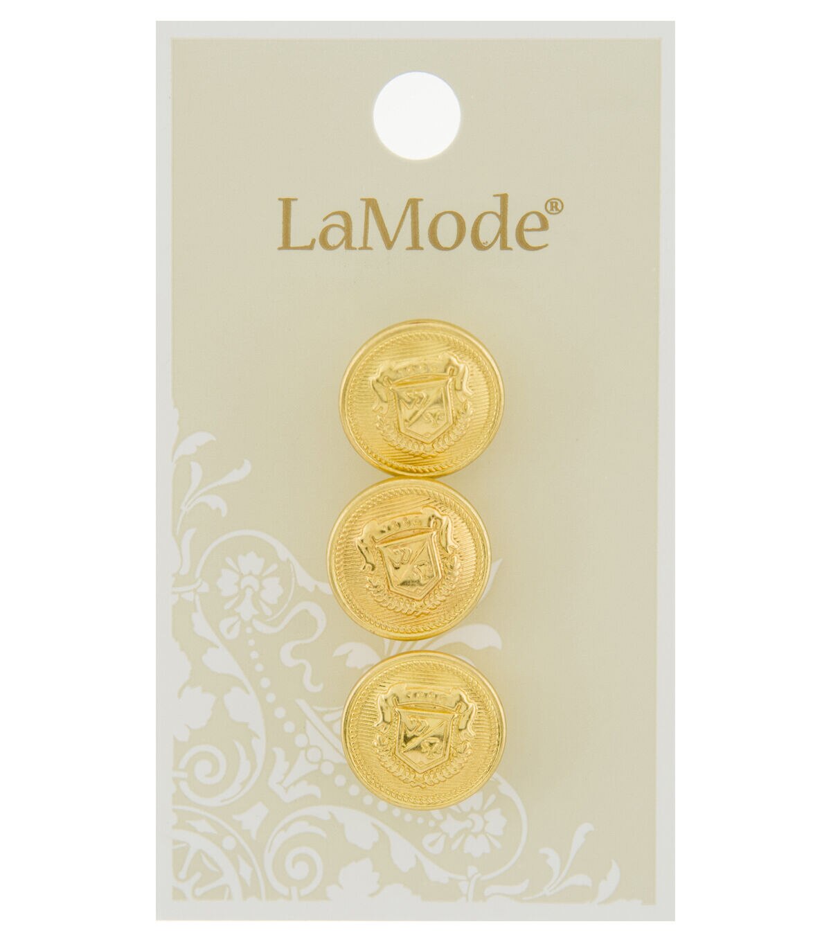 The La Mode Shank Buttons Gold Crest will make a great addition to your sewing kit. These shank buttons sport a gold tone and an embossed crest symbol. They will look great on coats, blazers and jackets. You can also use them to decorate handbags, totes and so much more.
