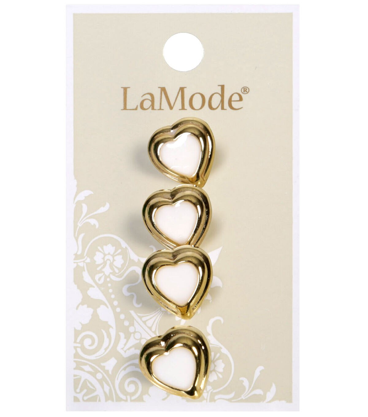 Give your handmade creations a new look with the La Mode Heart Buttons - White & Gold. Flaunting a gold-toned rim and white center, these heart-shaped buttons will be perfect for tops, dresses, skirts and more. You can also use them to adorn headbands, aprons and bags or decorate DIY decor accents.