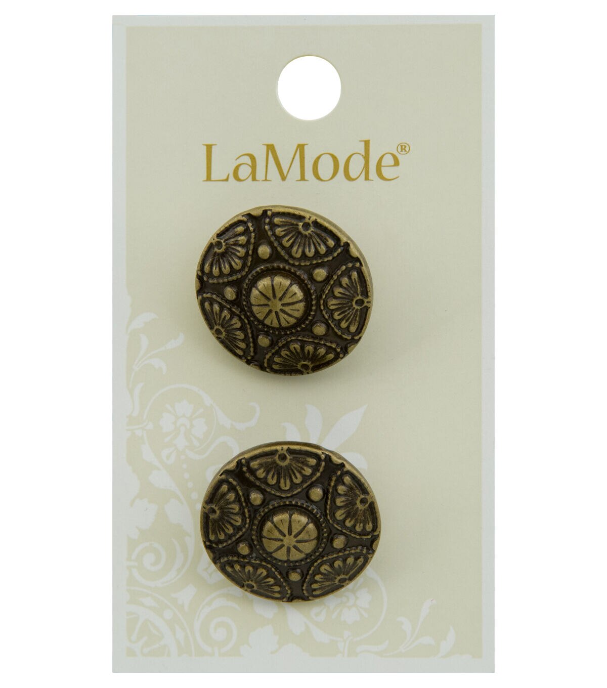 The LaMode Shank Buttons-Antique Gold will make a beautiful addition to apparel of any color. You can also use them as mock buttons for decorative requirements or as fasteners. They display a beautiful engraved design, and sport an antique gold tone. This pack contains two shank buttons.